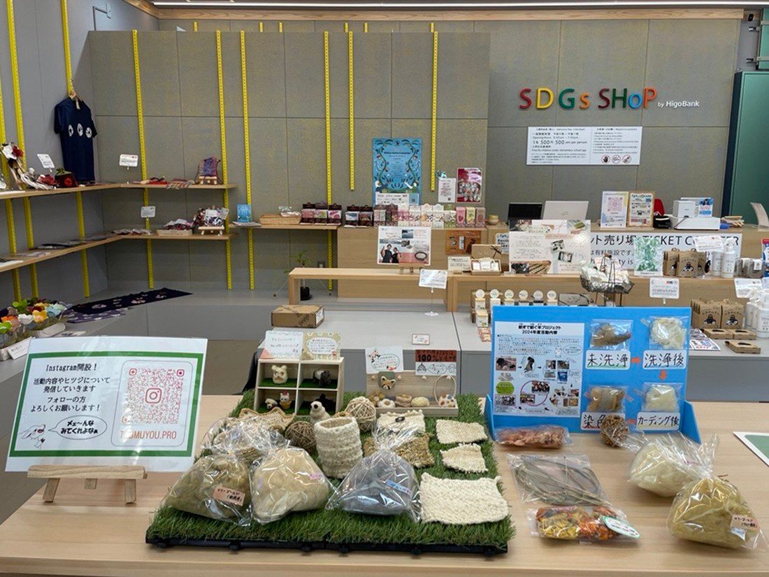 本プロジェクトは阿蘇の羊飼育において廃棄されている羊毛の加工利用を通じて、持続的地域社会発展への寄与を目的に2024年4月に発足。メンバーたちは毎年夏前に阿蘇の農家で飼育されている羊毛30~40kgを刈り取り、汚れた部分を除去してから洗浄し、マリーゴールドの花がらや研究目的で育てたブルーベリー、学食から出たタマネギの皮といった天然素材で羊毛を染色して作品を制作してきました。ミライパークを運営する株式会社肥後銀行と熊本・阿蘇くまもと臨空両キャンパスが24年8月に締結した包括連携協定の一環で常設販売が決定し、ペン立てやブローチ、マスコットやコースターなどを制作。メンバーの要望で売り上げは全額、肥後銀行と関連会社で組織する愛護基金に寄付し、阿蘇の草原の保全・再生に活用されます。