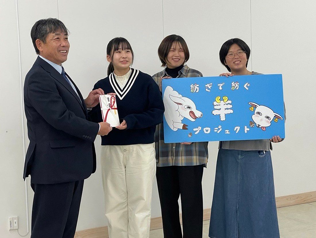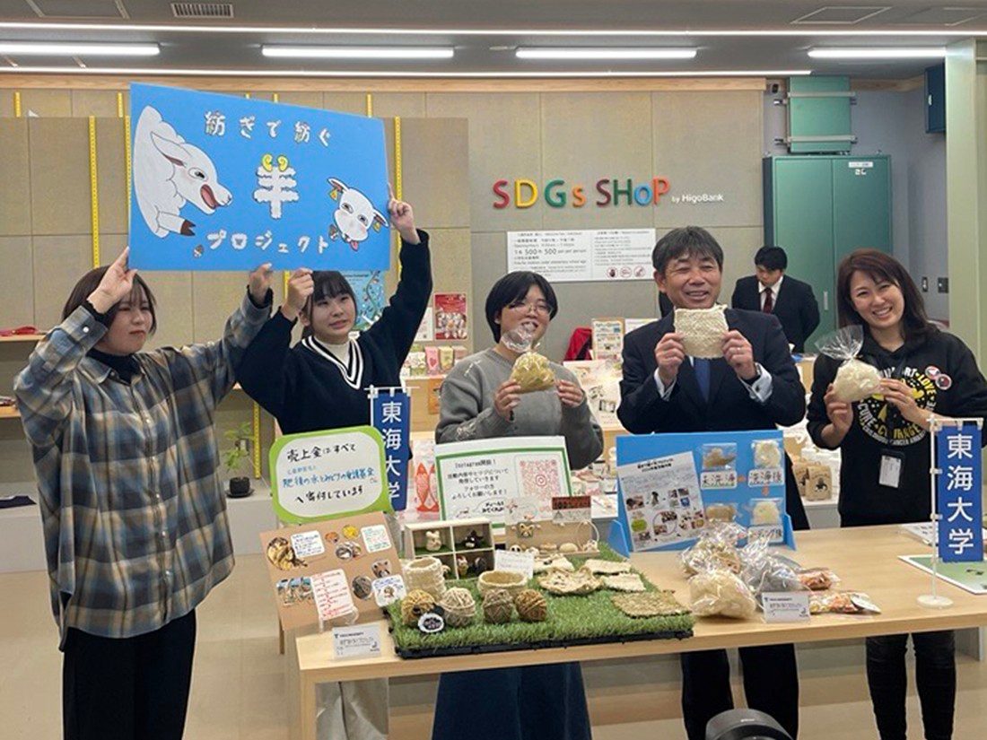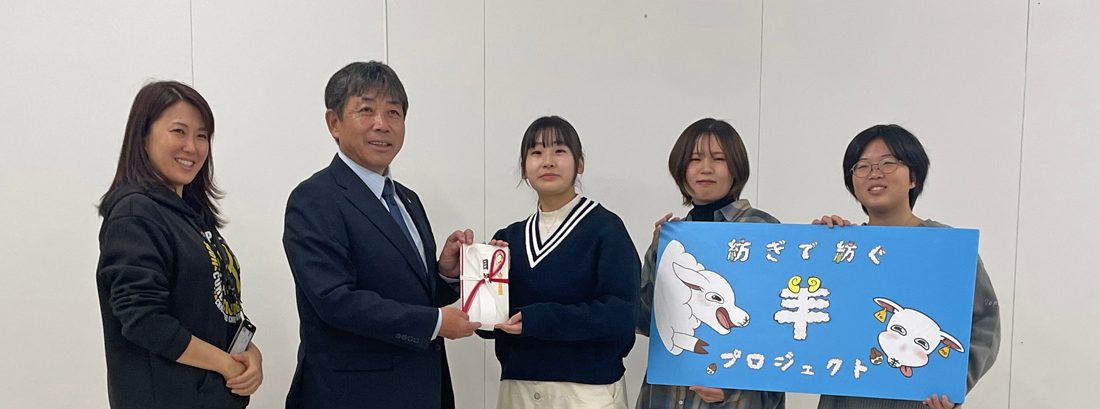 ToCoチャレ「紡ぎで紡ぐ羊プロジェクト」が昨年12月16日から、阿蘇くまもと空港に隣接する教育テーマパーク「くまもとSDGsミライパーク」で羊毛を使ったハンドメイド作品の常設販売を開始。今後、売り上げを公益財団法人「肥後の水とみどりの愛護基金」に寄付するため、プロジェクトリーダーの加茂朱李さん(農学部3年次生)から愛護基金の田邊元事務局長に目録を手渡しました。