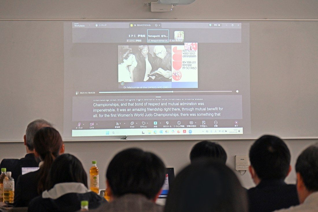 初めにSPCの陸川章所長が開会のあいさつに立ち、本研修会の立ち上げに携わった山下泰裕教授(体育学部)から寄せられた「学生の人間力や競技力の向上には、指導者が己を磨き、常にセルフコントロールできる姿勢が大事」といったメッセージを代読。「本研修を通じて指導者同士の連携を深めましょう」と語りました。今回は2つのテーマについて学外の講師を招いて講演が行われ、まず「ラスティ・カノコギと松前重義が夢見た世界 -女子柔道オリンピックへの道のり-」と題してカノコギ氏の娘であるジーン・カノコギ氏(米国在住)がオンラインで講演。当時、国際柔道連盟会長だった学園の創立者・松前重義博士と二人三脚で女性スポーツの振興に尽力し、女子柔道の五輪種目認定に貢献した「女子柔道の母」と呼ばれるラスティ・カノコギ氏の人生を紹介しました。さらに、日本ラグビーフットボール協会の15人制男子日本代表チームディレクターを務める永友洋司氏は、「勝つための準備をデザインする:世界と戦うラグビー日本代表の組織構築と『Winning Well』の実践」のテーマで登壇。チームのマネジメント責任者として各種活動を統括する自身の役割や、組織運営で意識しているポイントと課題を語り、「世界一になるために現状のチーム運営は本当に正しいか、という視点を常に持ち、選手が試合で最高のパフォーマンスを発揮するための土台をつくっています。ただ、その上で体調やメンタルを整えられるかは選手次第。自分自身がどうありたいか考え、自己管理できる選手が集まれば組織も強くなっていきます」と語りました。