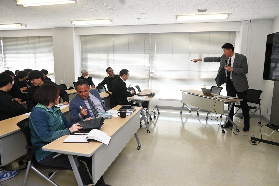 講演では、出身地の新潟県で過ごした幼少期の思い出や、祖母からの「負けるが勝ちだわや」という教えを胸に競技に打ち込んだ選手時代を回顧。東海大着任時のチーム状況を振り返り、「それまで3部だったチームに“目標はインカレ優勝”と伝えると、最初はみんな笑っていました。高みを目指すためには具体的にどんな姿で勝ちたいかを想像することが大切だと思い、私は“選手がこのチームでプレーしたいと思う”“周りの人に愛される”チームにしたいと考えました。真面目な指導者ほど短所を是正しようとしてしまいますが、いい部分を褒める、一つのことを磨く、折に触れてチームアイデンティティを振り返り“どんなチームになりたいか”を考えるよう意識していました」と説明。聴講者がペアになり、互いのいいところを3つ褒め合う簡単なワークも行いました。また、日本鋼管の社員時代に取り組んだプロジェクトやアメリカでの留学経験から、前向きな姿勢や仲間との協力などの重要性を強調。「社員時代にお世話になった工場長は、今も東海大の試合に足を運んで応援してくれています。これまでの人生のプロセスが、チームの根幹につながっていると思います」と語りました。
