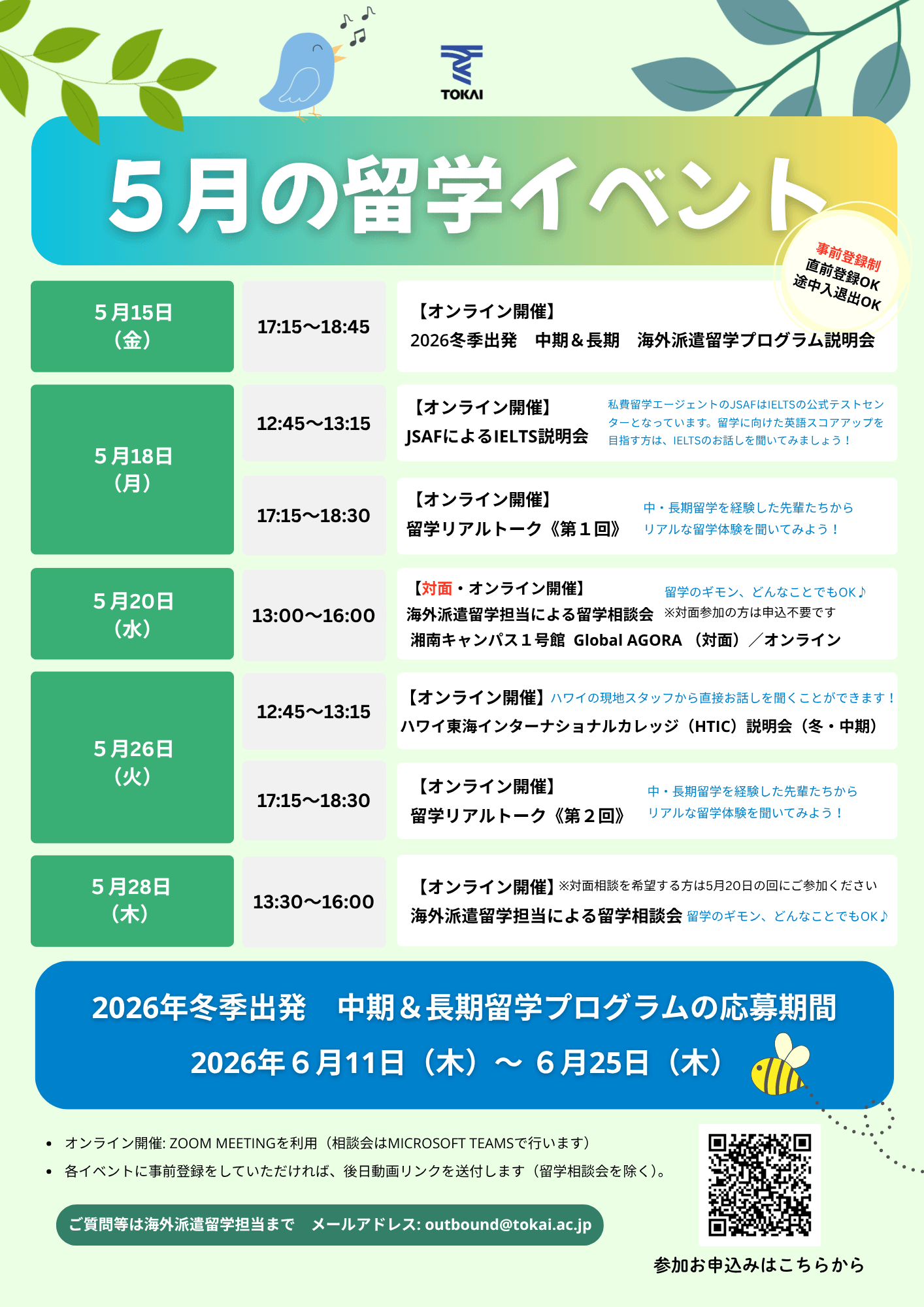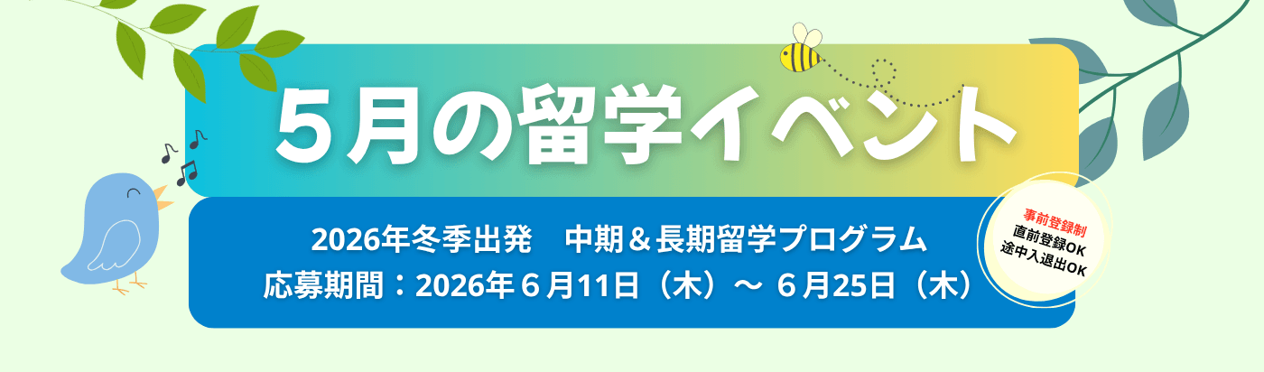 2026年度 冬季出発 中期&長期 海外派遣留学プログラムの募集が6月11日(木)から始まります。そちらに向けて留学イベントを企画しましたので、新入生の方を含め、本学の留学プログラムに興味のある方も迷っている方も奮ってご参加ください。東海大学にはたくさんの留学プログラムがありますよ♪在学中に留学をお考えの方は今から情報収集を始めましょう!