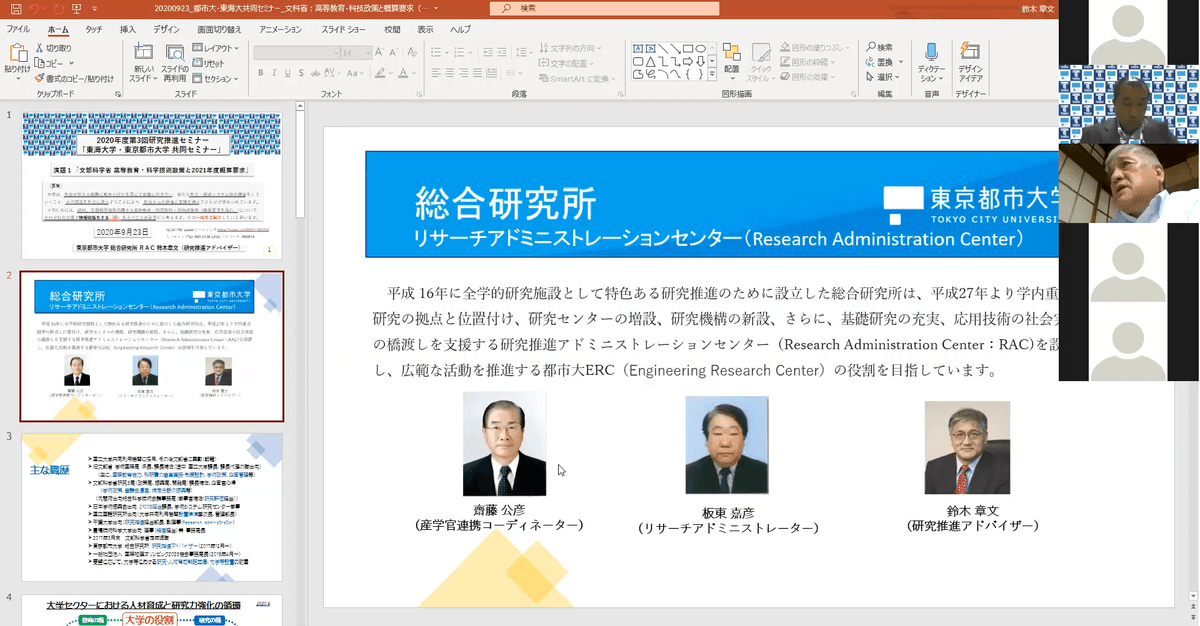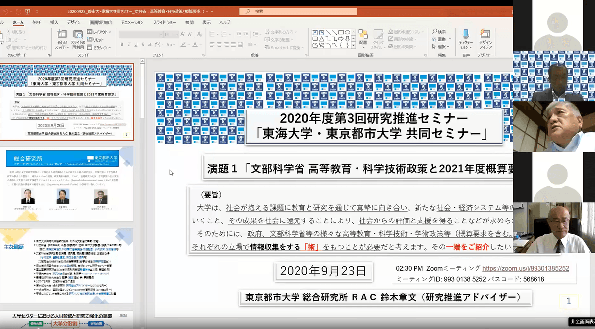 東海大学では9月23日にオンラインで、2020年度第3回研究推進セミナーを開催しました。本セミナーは、教職員や学生の日々の業務や研究活動に役立つ情報を提供する場として、研究推進部が2015年度から開いているもの。今年度は新型コロナウイルス感染症の拡大を受け、オンラインで実施しています。今回は、研究交流に関する包括協定を締結している東京都市大学と共催し、「文部科学省高等教育・科学技術政策と2021年度概算要求」と「国際交流と安全保障輸出管理」をテーマに講演と意見交換を行いました。