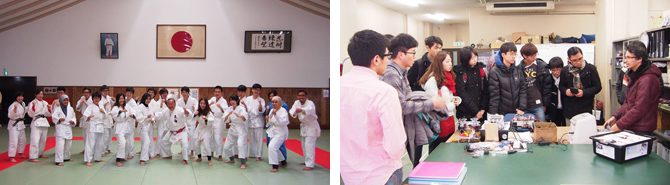 また、工学部動力機械工学科の荻野弘彦教授の電気自動車や精密工学科の山本佳男教授の研究室で取り組んでいる災害救助ロボットを見学するラボツアーも実施。高輪キャンパスでは、情報通信学部情報メディア学科の濱本和彦教授の指導を受けながら、3Dバーチャルリアリティを体験する講座を受講、国際教育センターの斉木ゆかり教授による茶道体験や体育学部武道学科の光本健次教授による柔道体験も行いました。