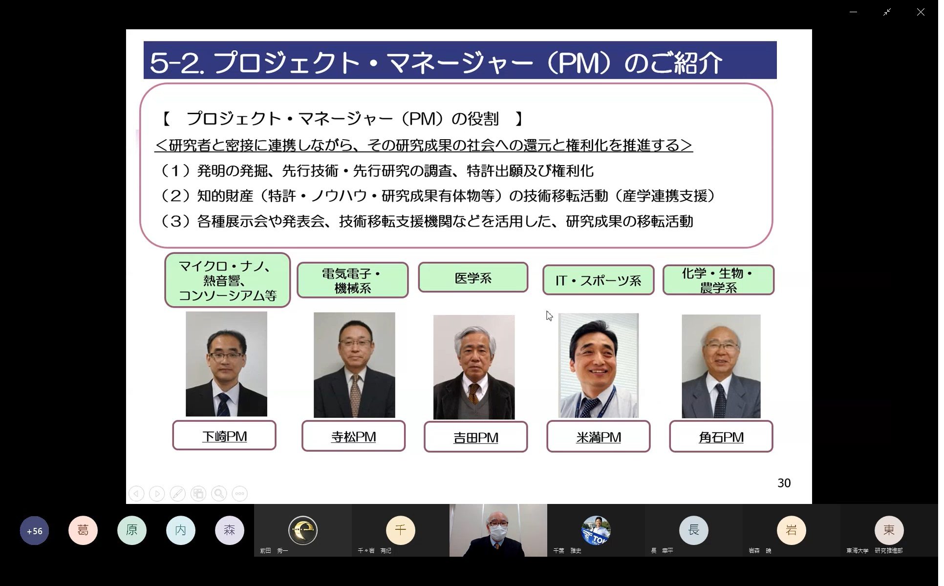 東海大学では3月1日にオンラインで、2020年度第4回研究推進セミナーを開催しました。教職員や学生の日々の業務や研究活動に役立つ情報を提供する場として、研究推進部が2015年度から開いているものです。今年度は新型コロナウイルス感染症の拡大を受けオンラインで実施しており、今回は「大学と特許」をテーマに講演とパネルディスカッションを行いました。