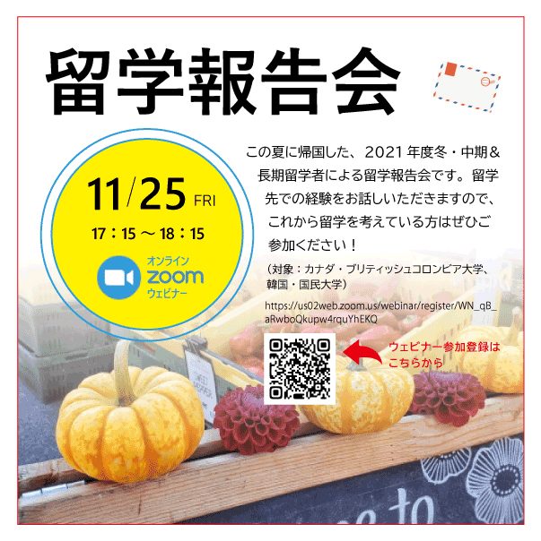 この夏に帰国した、2021年度冬・中期&長期留学者による留学報告会を開催します。留学先での経験をお話しいただきますので、これから留学を考えている方、留学に興味がある方はぜひご参加ください!