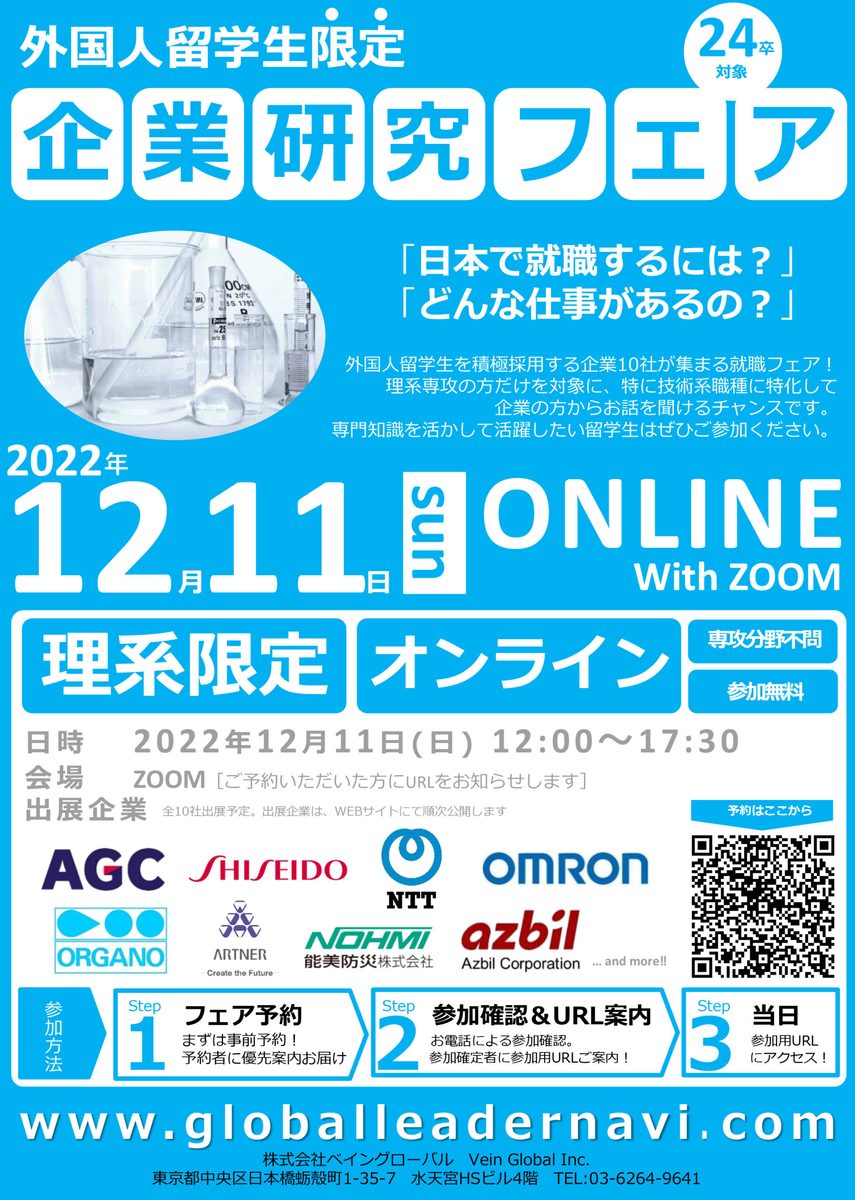 ■内容:外国人留学生を積極採用する企業10社が集まる就職フェア!理系専攻の方だけを対象に、特に技術系職種に特化して企業の方からお話を聞けるチャンスです。専門知識を活かして活躍したい留学生はぜひご参加ください。