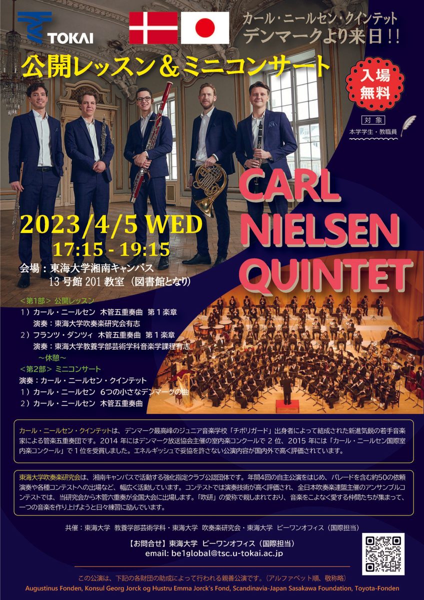 当日は、カール・ニールセン・クインテットによるミニコンサートや、東海大学吹奏楽研究会のメンバーや教養学部芸術学科音楽学課程の学生を対象とする公開レッスンを予定しています。ぜひデンマークの生の音を聴きに来てください。