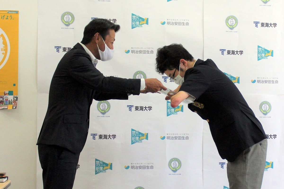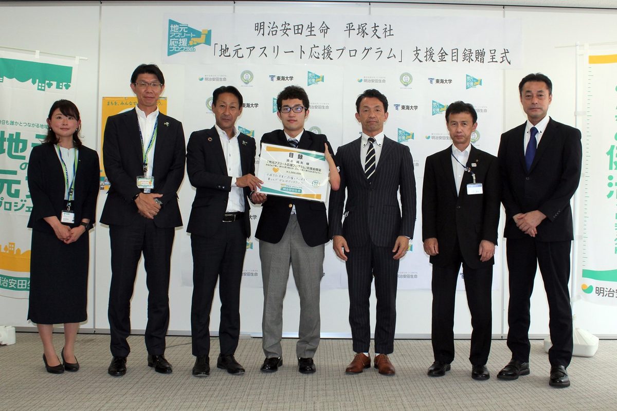 パラ水泳選手の浜本純矢選手(健康学部4年次生)が明治安田生命保険相互会社主催の「地元アスリート応援プログラム」に選ばれ、5月28日に明治安田生命平塚支社で支援金100万円が贈られました。同プログラムは、明治安田生命「地元の元気プロジェクト」の一環で2020年11月からスタートした取り組みで、地元から世界への挑戦を目指すアスリートに「思いを発信する場」を、アスリートを支える地域の方々には「応援する場」を提供することで、地域の一体感を醸成し、子どもたちの夢や地元愛を育むことを目指しています。今年度は、自薦や他薦などで集まった多くの候補者の中から28都道府県、総勢32名の若手トップアスリートが選ばれ、浜本選手もその1人に名を連ねました。パラアスリートでは唯一の支援アスリートになります。