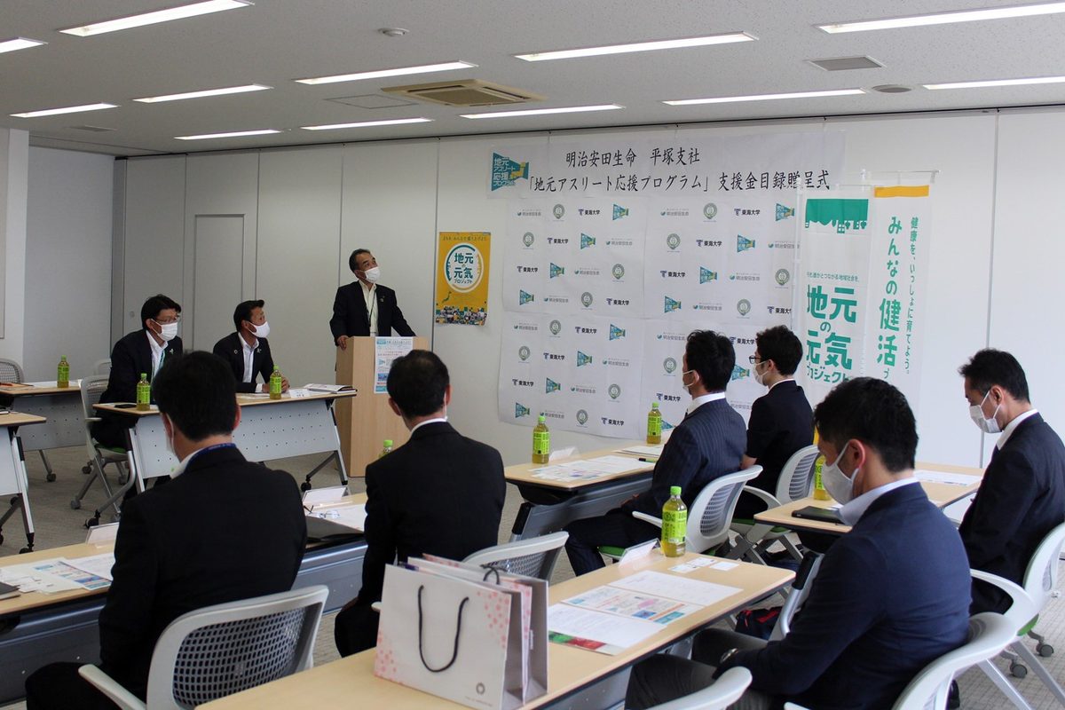 目録贈呈式には浜本選手と所属する水泳部の加藤健志部長(スポーツ医科学研究所准教授)ら大学関係者5名と、明治安田生命から浅野康平塚支社支社長ら4名、平塚市から今井高司企画政策部部長ら3名が出席。浅野支社長から浜本選手に目録が贈呈されました。今井部長は、「浜本選手が今回の支援アスリートに選ばれたのは、厳しいトレーニングなどの日々の努力と素晴らしい実績の賜物です。平塚市として、今後も地域とともに地元アスリートをいっそう応援していくとともに、心のバリアフリーや多様性を尊重する取り組みを推進してまいりたいと考えています」と祝辞が送られました。明治安田生命平塚西営業部の門岡泰弘営業部長からは、「先日面接でお会いした際に浜本選手の考え方や競技に取り組む姿勢、発言力に驚き、その場でファンになりました。このような形で支援できることをうれしく思っています。まずは1年間ですが、平塚市や伊勢原市、秦野市を中心に多くの方に浜本選手のことを知ってもらい、パラ水泳の普及・発展に少しでもお力になれればと思っています」との言葉が述べられました。