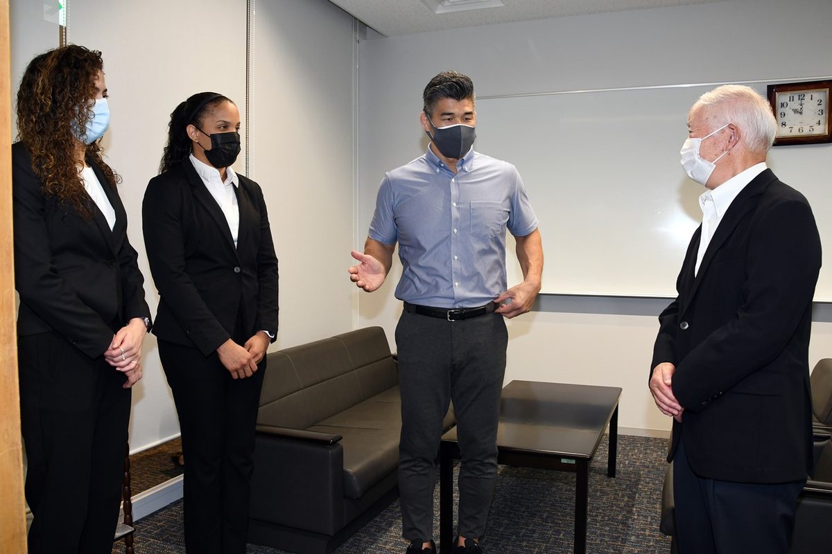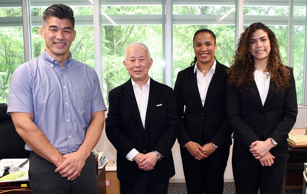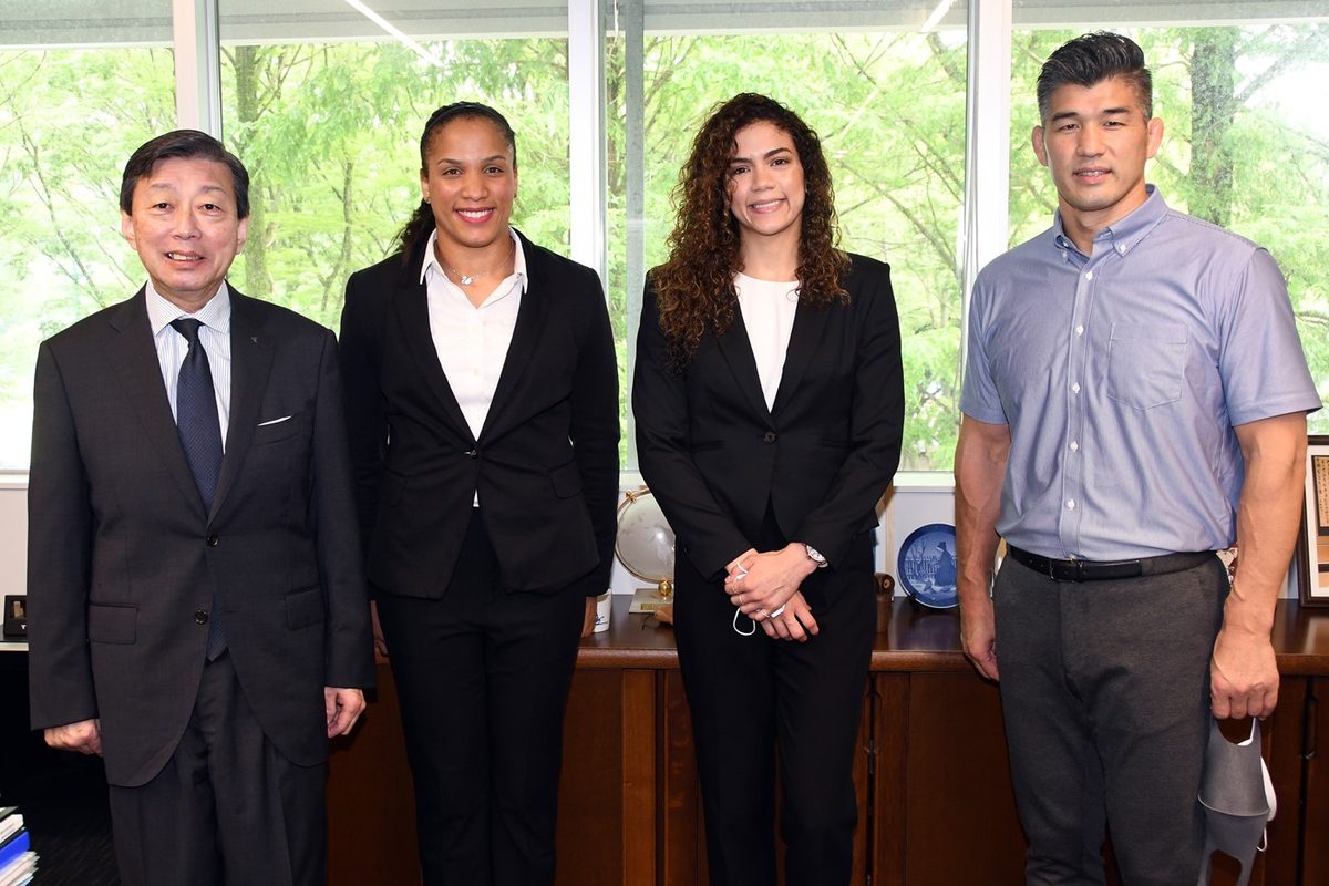 湘南キャンパスで7月7日に、陸上競技と柔道の選手・監督らが髙野二郎副総長と山田清志学長ら教職員に東京五輪代表内定を報告しました。陸上男子400mリレーの日本代表に内定した陸上競技部短距離ブロックのデーデー ブルーノ選手(体育学部4年次生)は髙野進監督(体育学部教授)、塚原直樹コーチ(体育学部研究生)とともに、6月24日から27日まで開催された日本陸上競技選手権大会での成績などを報告。デーデー選手は、「代表に内定したときはホッとした心境でしたが、今は目標である金メダル獲得に向けて気持ちを切り替えています。今後は日本代表メンバーによる合宿も実施されるので、コミュニケーションをとりながら本番まで貴重な経験を積みたい。陸上競技部はもちろん、東海大学の代表として誇らしい結果が残せるよう精いっぱい走ります」と語り、髙野監督は、「日本のリレーは世界的に見てもトップレベルの選手たちがそろっています。デーデー選手はまだまだ発展途上なの部分もありますが、日本選手権の100mと200mで2位に入った勢いに乗って日本の金メダル獲得に貢献する走りを期待してください」と話しました。