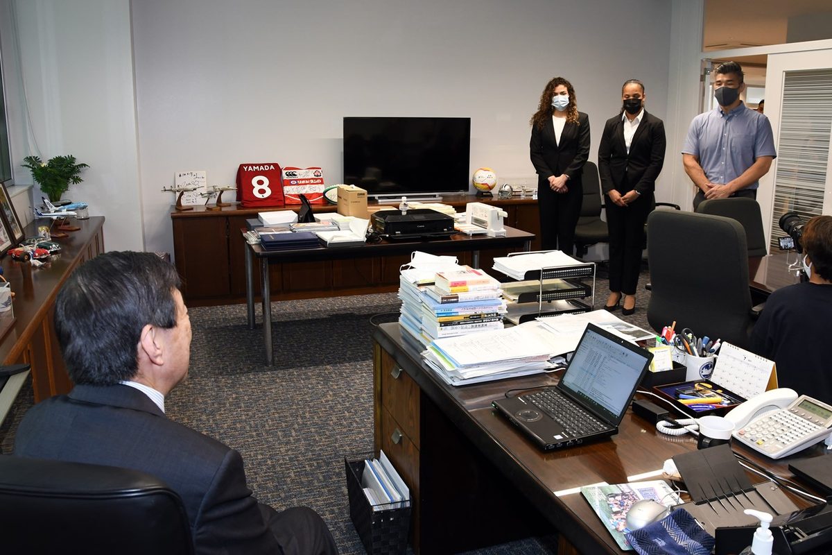 髙野副総長は、競技を始めたきっかけや普段の練習について尋ねながら、「皆さんの活躍に大きな期待がかかっています。気苦労も多いと思いますが、ぜひ頑張ってください」と語りかけ、山田学長は、「新型コロナウイルス感染症の拡大もあり、開幕前に壮行会を開催することはかないませんでしたが、テレビを通して応援しています」とエールを送りました。