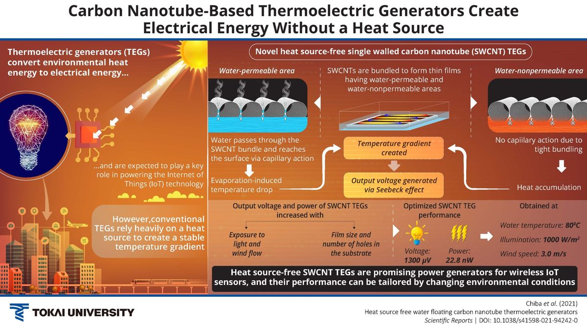 Thermoelectric generators that produce electricity from heat are limited in their applicability, owing to their heavy reliance on a heat source. To solve this issue, researchers from Tokai University, Japan, have fabricated a novel carbon nanotube-based thermoelectric generator capable of producing electricity upon contact with water, without relying on a heat source. They examine the generator’s performance and speculate that it is a promising power source for sensors widely utilized in IoT technology.
