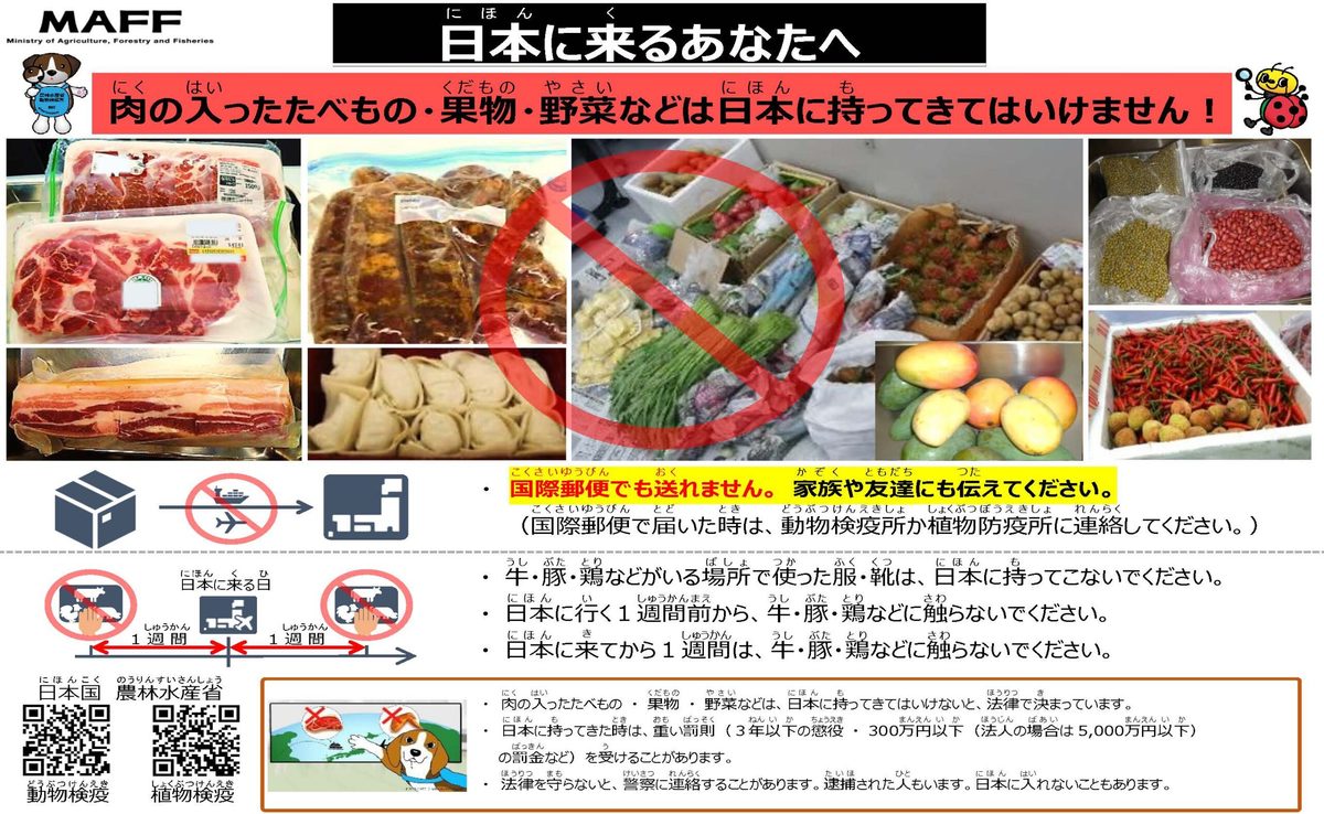 3 留学生自身のみではなく、訪日する家族や知人が、肉製品や果物・野菜等を日本に決して持ち込まないよう注意するとともに、郵便物としても日本に送付しないことを徹底してください。