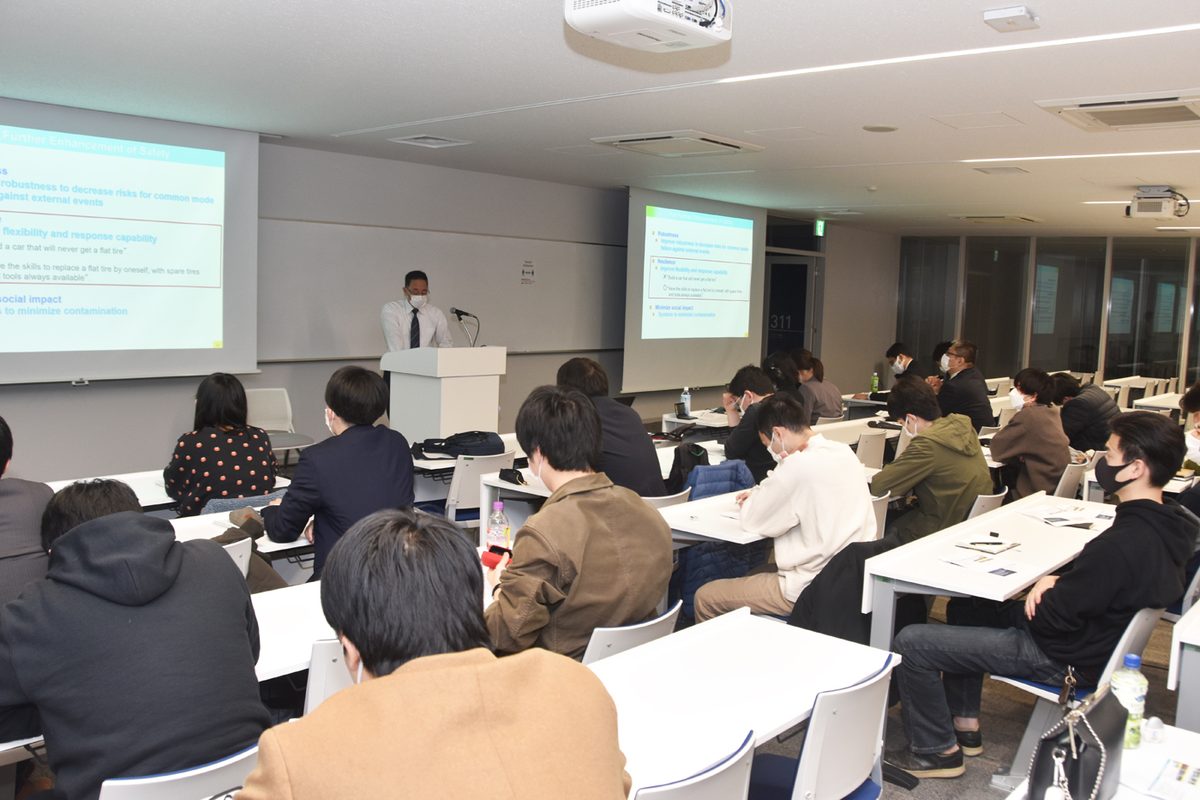 3月1日には湘南キャンパス19号館で、日本原燃株式会社代表取締役の増田尚宏氏による講義を実施。スクール受講者にオンラインで配信し、会場では大学院工学研究科の大学院生と工学部原子力工学科の4年次生約60名が聴講しました。2011年に発生した東日本大震災時に東京電力福島第二原子力発電所で所長を務めていた増田氏は、震災発生時の現場の様子や被害拡大を防ぐためにとった対応を説明。津波の被害で電源系統が故障し原子炉の除熱ができなくなり、電力が喪失していない施設から手作業で約9kmのケーブルを引き海水ポンプを復旧して全ての原子炉を冷温停止した対応事例を振り返り、「40年以上会社に務め、職員一人ひとりの人間性や得手・不得手を理解していたからこそ、緊急事態に誰に何を頼むべきか瞬時に判断することができました。チームワークが何よりも重要だと改めて感じましたし、チーム一体となって立ち向かったからこそ震災を乗り越えられたと感じています。皆さんも将来は人の上に立ち組織を動かす日が来ると思いますが、新入社員のときの気持ちを忘れず、すべての人の安全を重視し役割分担を与えることでチームに一体感を持たせることがリーダーの役目であることを覚えておいてください」と語りかけました。