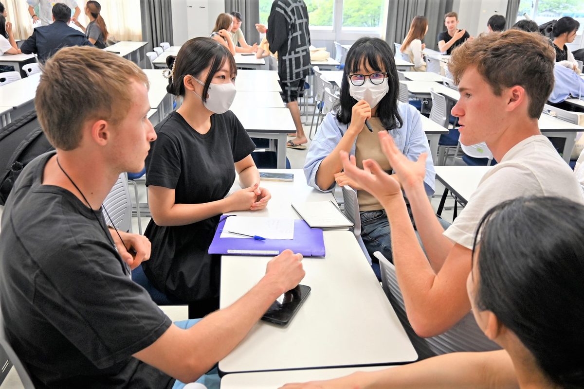 湘南キャンパスで7月13日に、茅ヶ崎市国際交流協会が実施している事業の一環で来日中のフランスの大学生を受け入れ、本学学生の授業見学と交流会を実施しました。以前からつながりのあった同協会から依頼を受け、7月8日に同協会で開かれた歓迎会にフランス語の授業を履修している学生らが参加。同世代の学生たちとさらに交流を深めたいといった留学生の要望を受けて湘南キャンパス訪問が実現しました。