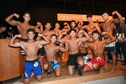 ボディビル競技は、全身の筋肉の大きさやキレ、バランスを審査するボディビル部門と上半身の筋肉の形状やプロポーションを中心に審査するフィジーク部門に分けられます。フィジーク部門は、近年の競技者増加を受けて身長別にクラスが分けられており、全日本学生選手権大会は3クラスで実施。各クラス10位以内に与えられる入賞ポイントの合計で総合優勝を争いました。ボディビル部からはフィジーク部門に8選手が出場し、170cm以下級で山田雄里杏選手(経営学部2年次生)が優勝。髙宮秀規選手(法学部4年次生)が2位に入りました。さらに、176cm以下級と176cm超級でもそれぞれ3選手が入賞し、創部3年目で初の栄冠に輝きました。