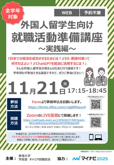 海外留学生対象日本での就職活動実戦講座【マイナビx東海大学】のお知らせです。
