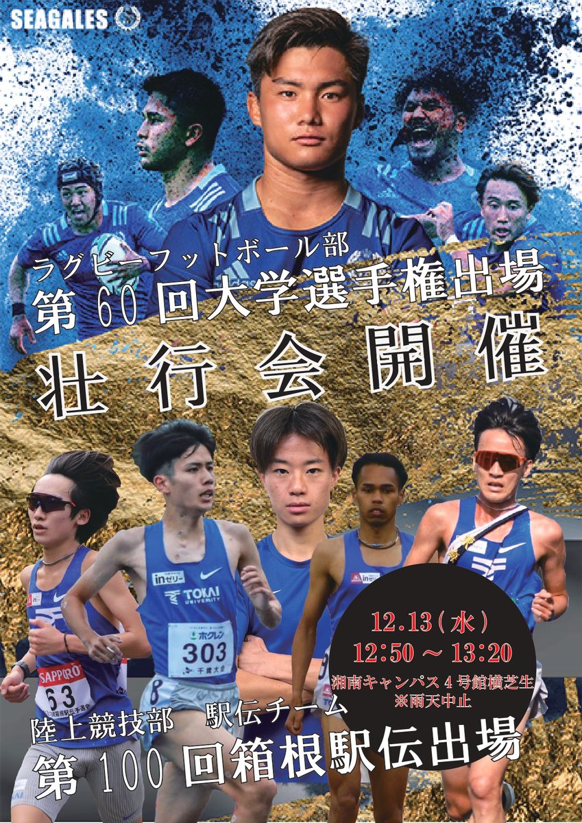 第100回東京箱根間往復大学駅伝競走(箱根駅伝)に出場する陸上競技部駅伝チームと、第60回全国大学ラグビーフットボール選手権大会に出場するラグビーフットボール部との合同壮行会を下記日時で実施いたします。どなたでもご参加いただけますので、駅伝チームとラグビー部への温かいご声援をお願い申し上げます。