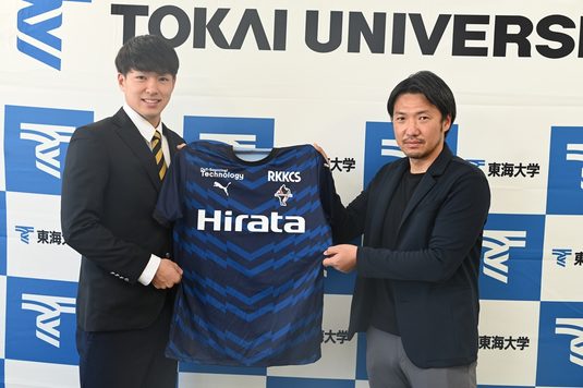 調印式後には、「この日を迎えられてホッとしています。ロアッソ熊本は今年の天皇杯でベスト4に入るなど勢いのあるチームなので、加入できてうれしい。東海大学では素晴らしい監督、コーチ、チームメートに支えられてきたので、心から感謝しています」と笑顔を見せました。今後に向けて、「とにかく試合に出てチームの勝利に貢献することだけを考えています。開幕からスタメンに選んでもらえるように万全の準備をしていきます」と話しています。浅田コーチは、「試合中は常に大きな声でメンバーを鼓舞するチームの精神的支柱。キーパーとしての能力も高く、向上心もある選手なので、これからもその姿勢を忘れずに日本を代表する選手へと成長を続けてほしい」と期待を語っています。