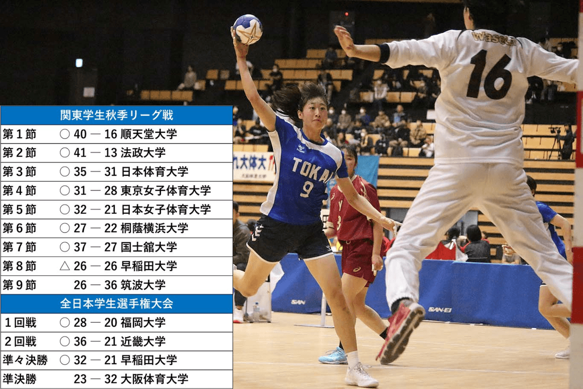 準決勝は昨年度の決勝で敗れた大阪体育大学との対戦に。試合序盤は持ち味である機動力を臆することなく発揮。押し込まれる展開が続いてもチーム一丸となってディフェンスし、速攻で得点を奪うなど粘り強いプレーを見せた。しかし、終盤は相手に連続得点を許し、23―32で敗れた。