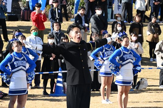 その後、応援団とチアリーディング部の指揮のもと、吹奏楽研究会が東海大学応援歌と校歌を演奏。最後に武藤選手と越選手が握手で健闘を誓い合いました。