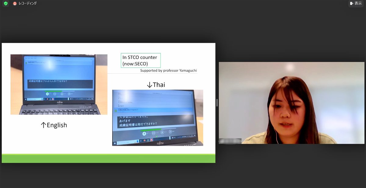 本年度参加者は昨年10月から12月にかけて行われたハワイ東海インターナショナルカレッジ(HTIC)やタイでの研修を踏まえ、「研修に参加した理由」「部署で抱えている国際交流に伴う課題」「研修を通して学んだこと」などを振り返りました。佐藤梢さん(病院運営企画室人事ユニット)は、「現地では積極的な声かけをはじめとしたコーチングスキルを学びました。今後も英語の勉強を続けて、翻訳なしで英語の読み書きができるようになりたいとあらためて決意しました」と語りました。昨年度参加者は、研修での経験を業務に還元する実践例を報告。HTICでの研修に昨年度参加した鈴木優里さん(学長室研究担当)は、当時所属していたサイエンステクノロジーカレッジオフィス(現:サイエンス・エンジニアリングカレッジオフィス)での経験と、研修後にオフィスのパソコンに導入した同時翻訳プログラムを紹介し、「留学生や外国人研究者とコミュニケーションを図るため、学長室国際担当の山口滋部長(理学部教授)に協力いただき、AIを使った同時翻訳プログラムを導入しました。英語やタイ語など複数の言語に対応しており、カウンターに設置しているパソコンを使って円滑なサポートができました」と話しました。