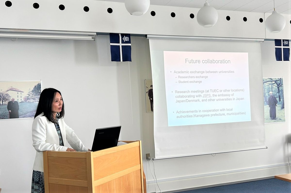 当日はまず、ヤコブ・スキュット・イエンセン事務長が本学とデンマークの関係性について説明した上で、施設・館内を見学しました。その後は、TUECの堀真奈美所長(健康学部教授)が本学の教育・研究の特徴ならびにIT系学部の学びについてスライド、動画を用いて発表。続いて、デンマーク短期研修中の読売広告社の中村賢昭氏から、過去に行われた同社と本学、神奈川県平塚市の連携事例について報告がありました。さらに、都市デザイン、大学との連携実績のあるゲール・アーキテクツ(Gehl Architects)のイーダ・ニールセン氏からは、アメリカのスタンフォード大学などとのキャンパス創造に関する発表がありました。こうした発表を踏まえ、本学とバイレ市、新設予定の大学の連携のほか、国際的な大学間の連携や、大学と地域、企業の連携のあり方、日本の大学とデンマークの大学の違いなどについて活発な意見交換が行われました。