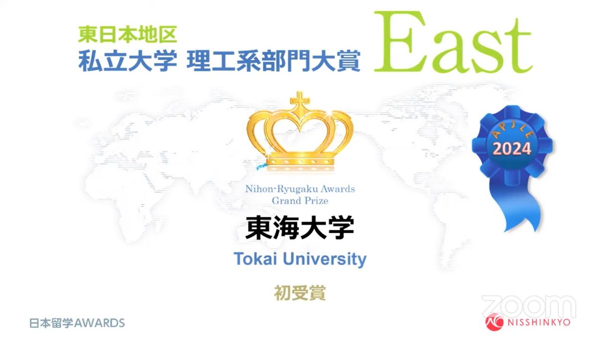 6月28日に発表された一般財団法人日本語教育振興協会「日本語学校教育研究大会」の2024年度「日本留学AWARDS」で、東海大学が東日本地区・私立大学理工系部門で大賞を受賞しました。同賞は、留学生視点に立った日本留学の環境を整備することを目的に、留学生に勧めたい進学先として選出されるものです。今回は、全国の日本語学校128校に勤務する教職員の投票を経て、5つの部門で東西地域選出のトップ10校が各部門賞校として選出。本学は「教育内容」「入試システム」「学習面の留学生サポート」が高く評価され、初めて同部門の大賞に選ばれました。
