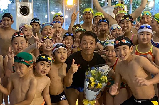 水泳部の加藤部長と選手たちが秦野市の水泳教室に協力しました