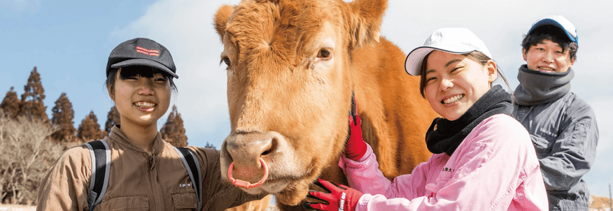 動物科学科では、動物生産科学を中心にして、動物の生命科学および環境科学の幅広い学識を身につけます。その学識を用いて動物生産や健全な自然環境・社会環境の維持・発展など命を理解し、人と動物の適切な関係を創造します。