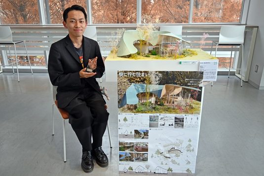 工学部(建築都市学部)建築学科3年次生の松井京一さんが、11月18日に東京都江東区の竹中工務店東京本店で開かれた「第23回住宅課題賞2023」(主催:一般社団法人東京建築士会)の公開審査で審査員賞「渡邊大志賞」を受賞しました。住宅課題賞は、建築の基本である住宅設計を通して建築への興味と社会的な意義への認識を深めることなどを目的に開かれています。40大学から推薦された55作品の模型とパネルを審査員が巡回審査し、上位16作品による最終投票で優秀賞3点、審査員賞5点が選ばれました。