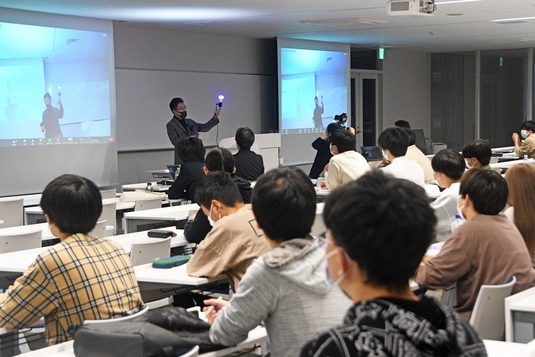 初めて対面での開催となった19号館の教室には本学部の1年次生だけでなく工学部建築学科や大学院工学研究科の学生ら多数が参加しました。澤田氏は照明デザインの領域や照明に携わる仕事について説明した後、デンマーク・コペンハーゲンと神奈川県・湘南海岸を例に白夜や太陽の沈み方の違いなどを解説し、「光の感じ方はどんな風土で育ったか、どんな場所で暮らしているかで変わってきます」と話しました。また、「LEDが登場したことで新たな光源の時代に入り、皆さんはその時代に生きている」と話し、最先端の照明機材を紹介しました。その後は自身が手がけた仕事を例に照明デザインの実態を解説。東京電機大学東京千住キャンパスは敷地を区切る壁がない「公開空地」であることから、「学生がいない夜間も公共の場としての安全性を確保するために照明をつける必要があります。公共の光を取り込み、街の一部に見える照明をデザインしました」と語りました。さらに、「設計は英語だとデザインと訳されますが、照明設計はアートとエンジニアリングで構成されています」と話し、エンジニアリングを重視した例として山形県・天童ポケットパークに設けた照明を紹介。歩く人より車で通りすぎる人が多いことに着目し、「時速50kmで走行した際に光のしぶきが目に留まるような照明を考えました。コンピューターで何度もシミュレーションしましたが、最終的には現場に出て、実際の環境で光を見ることが大切」と語りました。