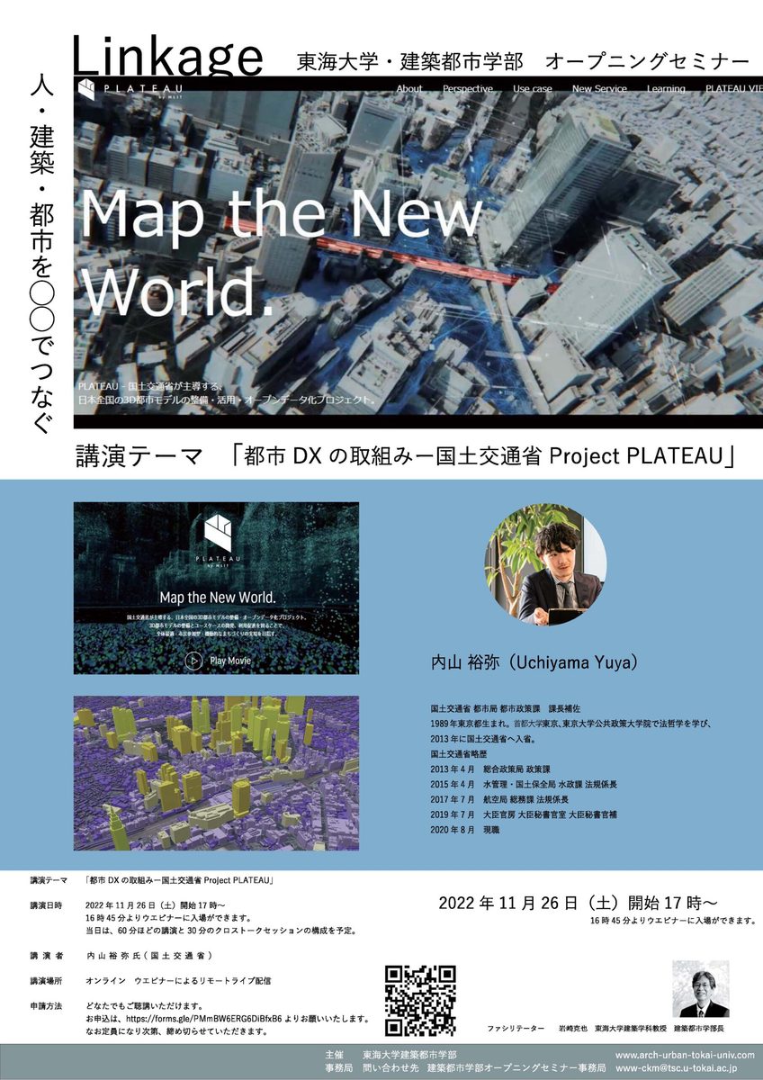 建築都市学部では11月26日(土)にオンラインで、建築都市学部オープニングセミナー「都市DXの取組み―国土交通省Project PLATEAU」を開催します。今年4月に開設した建築都市学部の理念や教育・研究活動を周知するとともに、建築にまつわる企業や行政、大学などの研究機関の識者らとそのあり方を考える機会とすることを目的としたものです。「Linkage 人・建築・都市を○○でつなぐ」を共通テーマとして昨年度から合計9回の講演を企画しており、第8回目となる今回は国土交通省都市局都市政策課課長補佐の内山裕弥氏が講師を務めます。参加は無料で、事前の登録が必要です。ぜひご参加ください。