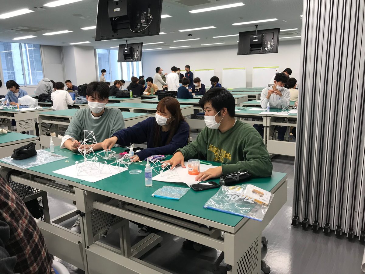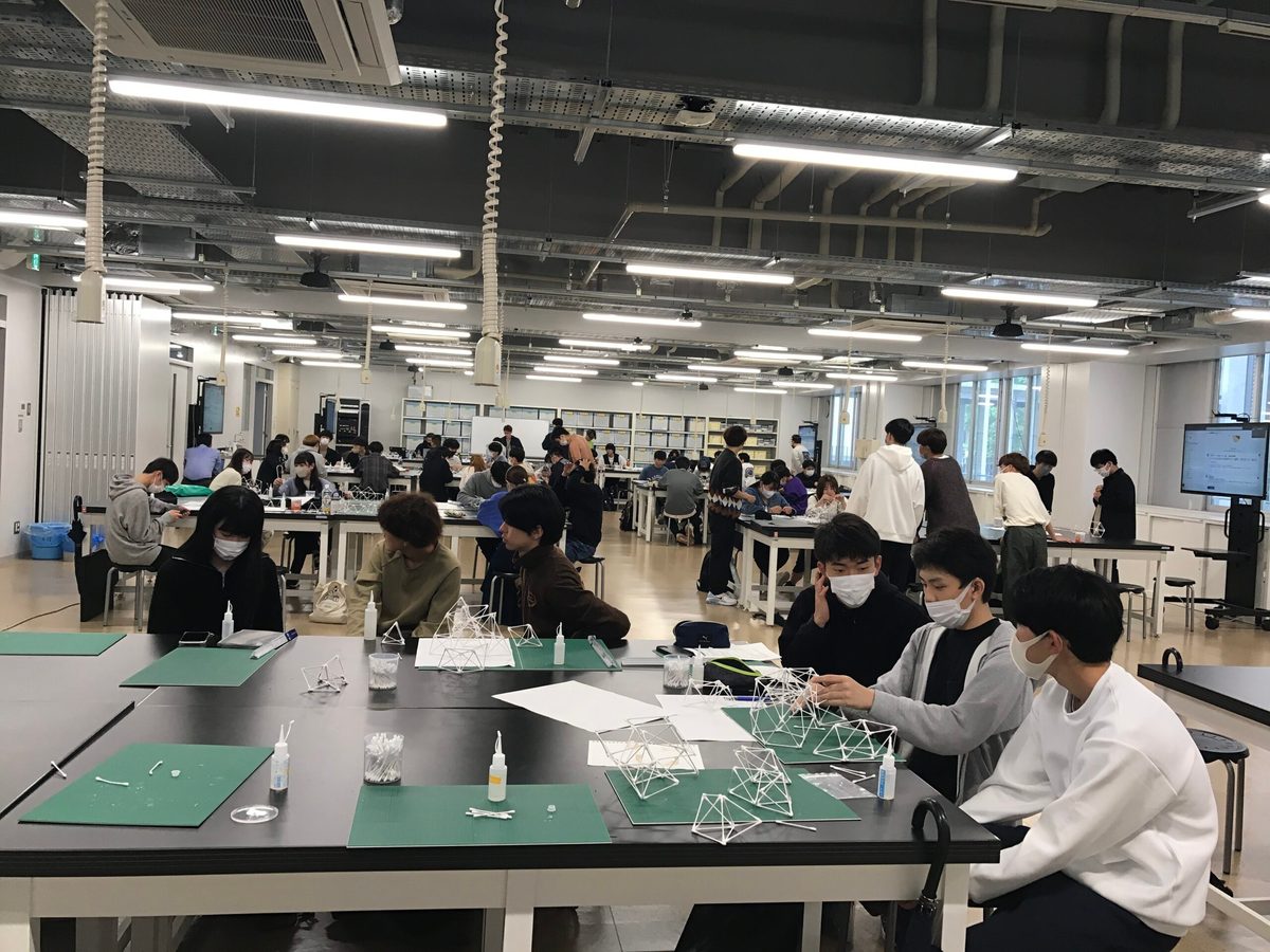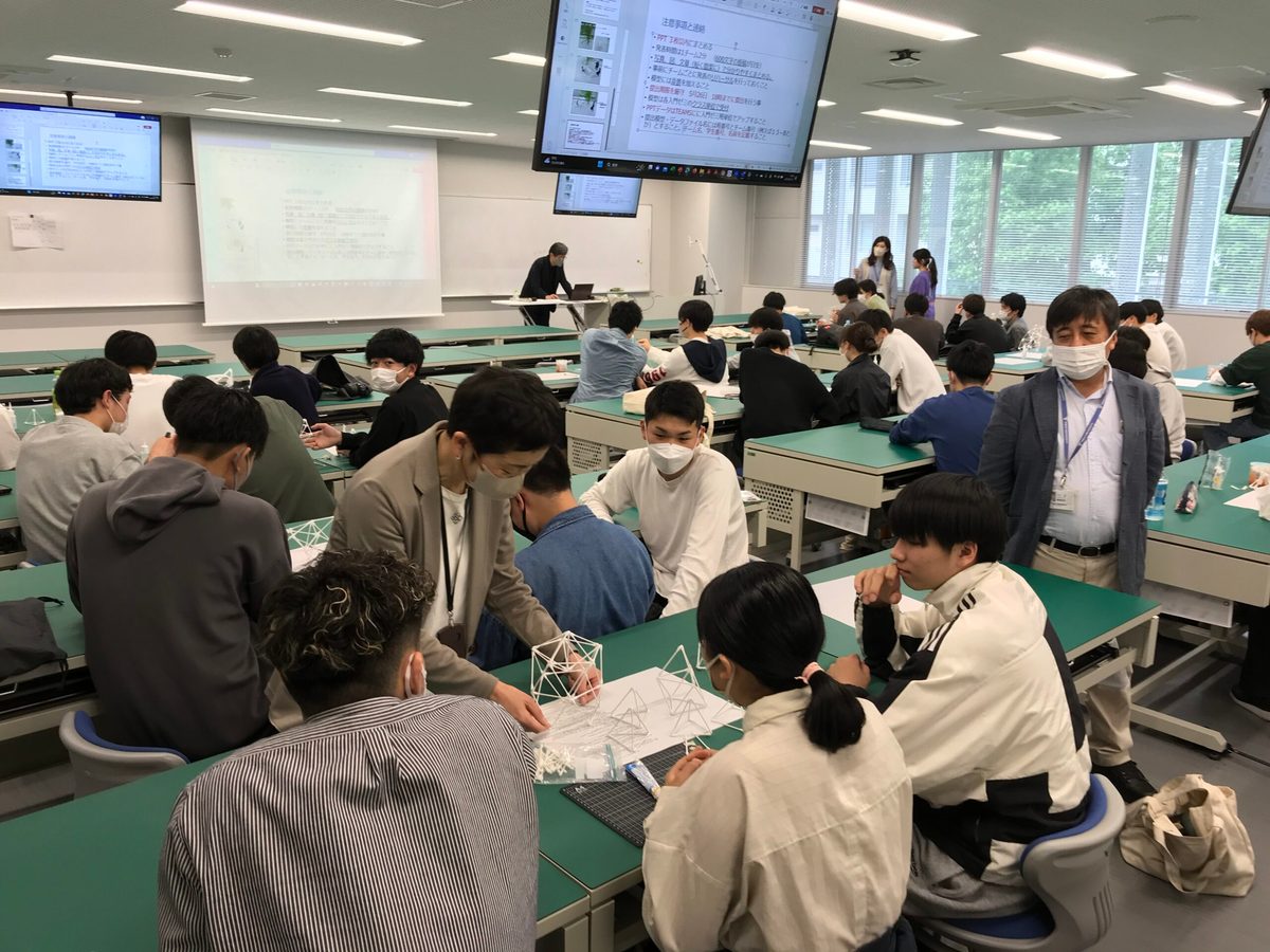 建築都市学部の1年次生を対象としたパビリオンプロジェクトの合同エスキースが2023年5月13日(土)の3時限、4時限目に行われました。今回で第2回目となり、各グループに分かれ、アイデアの着想、形を考える「エスキース」に取り組みました。
