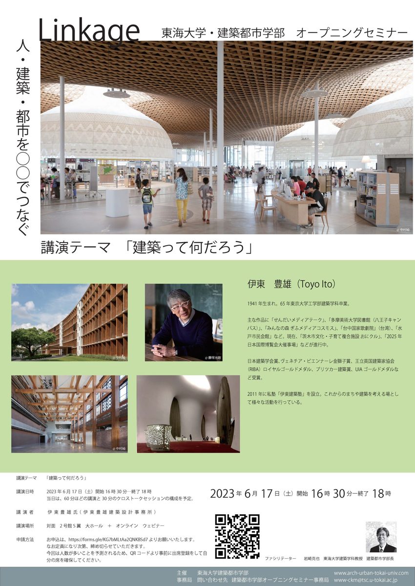建築都市学部では6月17日(土)に2号館大ホールとオンラインで、建築都市学部オープニングセミナー「建築って何だろう」を開催します。昨年4月に開設した建築都市学部の理念や教育・研究活動を周知するとともに、建築にまつわる企業や行政、大学などの研究機関の識者らとそのあり方を考える機会とすることを目的としたものです。「Linkage 人・建築・都市を○○でつなぐ」を共通テーマとして2021年度から合計9回の講演を企画しています。最終回となる今回は、日本建築学会賞を2度受賞し、建築会のノーベル賞ともいわれる「プリツカー賞」にも輝いた世界的に活躍する建築家の伊東豊雄氏が講師を務めます。参加は無料で、事前の登録が必要です。ぜひご参加ください。
