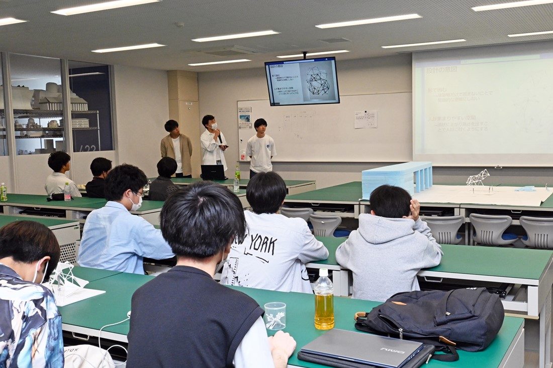 4チームに表彰状を授与した梶井学長代理は講評で、「どの作品もレベルが高く、最優秀賞と優秀賞の差はほとんどありませんが、コンセプトをしっかりまとめ、プレゼンしてくれた点を評価しました。皆さんには大きな可能性があります。これからも頑張ってください」と語りかけました。最優秀賞に選ばれた3名は、「審査会で先生方から指摘された課題を解決し、プレゼン資料の内容も詰めて臨みました。来場者に時の流れを肌で感じてもらえるパビリオンになるよう、先生方や先輩方とも協力して制作していきたい」と語りました。今後は工学部建築学科や大学院工学研究科の学生も交えたプロジェクトチームを立ち上げ、応力解析や設計図の作成などを経て、10月下旬に学生たちの手で建設する予定です。