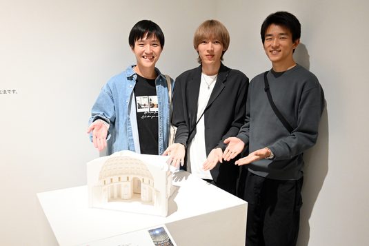 この展覧会は、古代から現代まで40点以上の名建築の構造模型を通して、建築における力の流れを感覚的に捉えられる構成となっています。展覧会のテーマである構造模型についてリサーチしていた担当者が本学を訪れ、内田涼大さん(3年次生)、浦勇樹さん(同)、田中悠仁さん(同)が「西洋建築史Ⅱ」の授業で制作したパンテオンの模型を見たことで、展示を依頼されました。展覧会は4つのテーマ展示で構成され、イタリア・ローマで約2000年前に造られた煉瓦積コンクリート造の大規模な建築であるパンテオンの模型は展示の導入部分に設置されています。同じ空間には「建築家と構造家の協働」として、構造家・佐々木睦朗氏と建築家・磯崎新氏、伊東豊雄氏、妹島和世氏、西沢立衛氏との協働による作品が展示されており、展覧会を企画したWHAT MUSEUM建築倉庫ディレクターの近藤以久恵氏は、「構造は建築を建築たらしめる重要な要素であり、ドーム空間の起源ともいえるパンテオンは、本展覧会の導入にふさわしいと考えました。そして構造をデザインする素晴らしい構造家の存在が、日本の現代建築を支えています。ドームからシェル、そして自由曲面による構造に至るまで、古代から変わらずこの地球上にはたらく重力をはじめとした力の流れをどうデザインして建築にしてきたのか。古代の建築物から現代建築までを歴史的な視点でとらえることができたらと、このような構成にしました」と語りました。