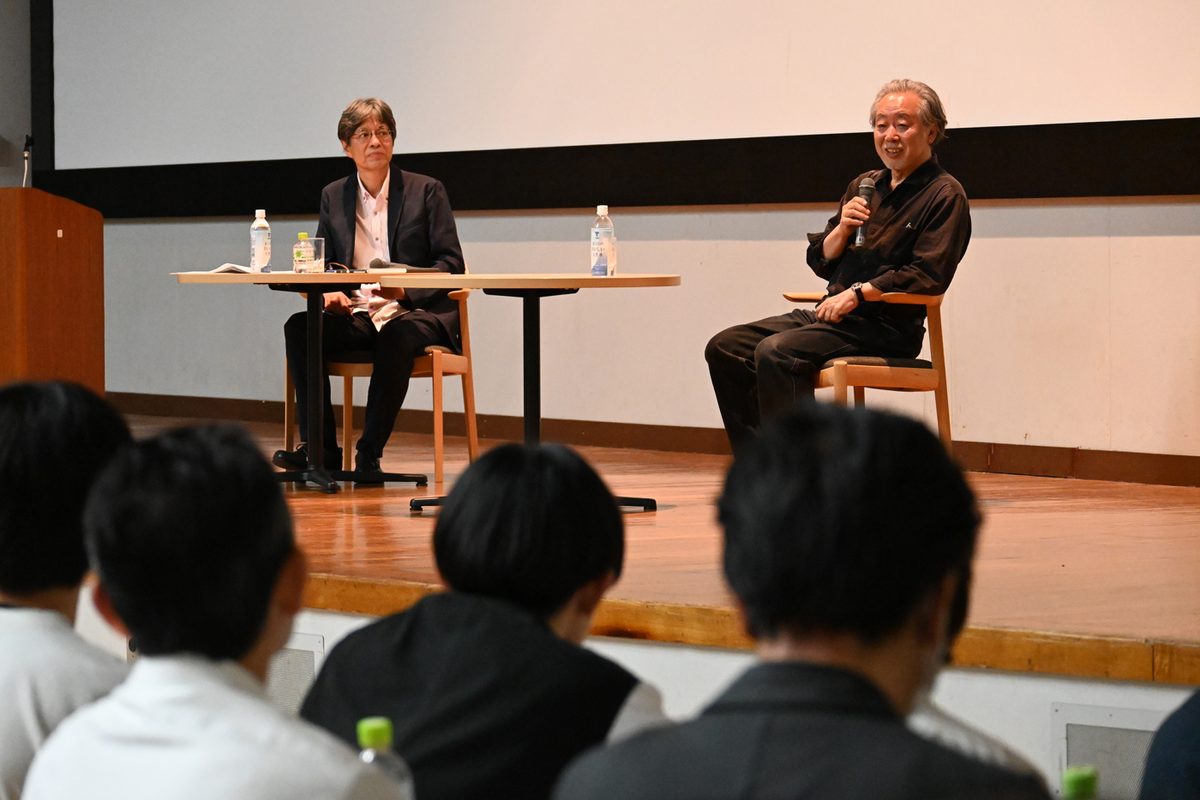 その後は岩﨑克也学部長との対談形式で、会場やオンライン参加者の質問にも回答。内藤氏は、「立派なものをつくるのではなく、その人が笑顔になってくれるか、その場所が本当に安心できるか、会話が弾むかどうかを考え、それらをつくる仕事だと思ったほうがいい。未来はおじさんたちが用意してくれるものではなく、皆さんが主権者です。こういう未来がほしい、自分が考える建築、土木はこうだとはっきり言っていい。勇気を持った若者が出てくることを期待しています」とまとめました。