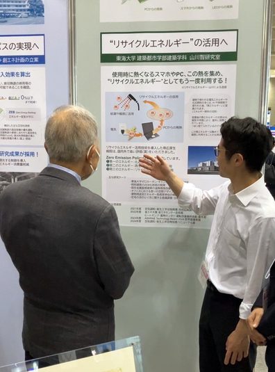 会場では、山川研究室の活動紹介のほか、昨年度の4年次生が卒業研究として取り組んだ5つのテーマとその成果をまとめたポスターを展示※。工学部建築学科4年次生と大学院工学研究科1年次生16名が交代でブースに立ち、来場者の質問に答えました。丸山稜太さん(4年次生)は、「病院のZEB(Zero Energy Building)化や山川教授が提唱するリサイクルエネルギーについての質問が多く、山川研の研究内容に対する来場者の関心の高さがうかがえました。私たちも他のブースを見て回り、企業の大規模な展示などがとても勉強になりました」と振り返りました。矢部陽菜さん(同)は、「大学生や高校生も多く来場していたことが印象的でした。普段は同じ東海大の学生や先生との議論が中心ですが、ブースでは来場者に応じて説明の仕方や話し方を工夫するなど、社会に出ても役立つ経験が積めました」とコメント。遠山栞さん(同)は、「研究対象の病院で働いていた方や利用者の方もブースを訪れてくださり、さまざまな話ができました。一般の人や企業の方はこういったところに興味や疑問を持つのかと、社会のニーズに直接、触れたことも今後の研究につながります」と語りました。