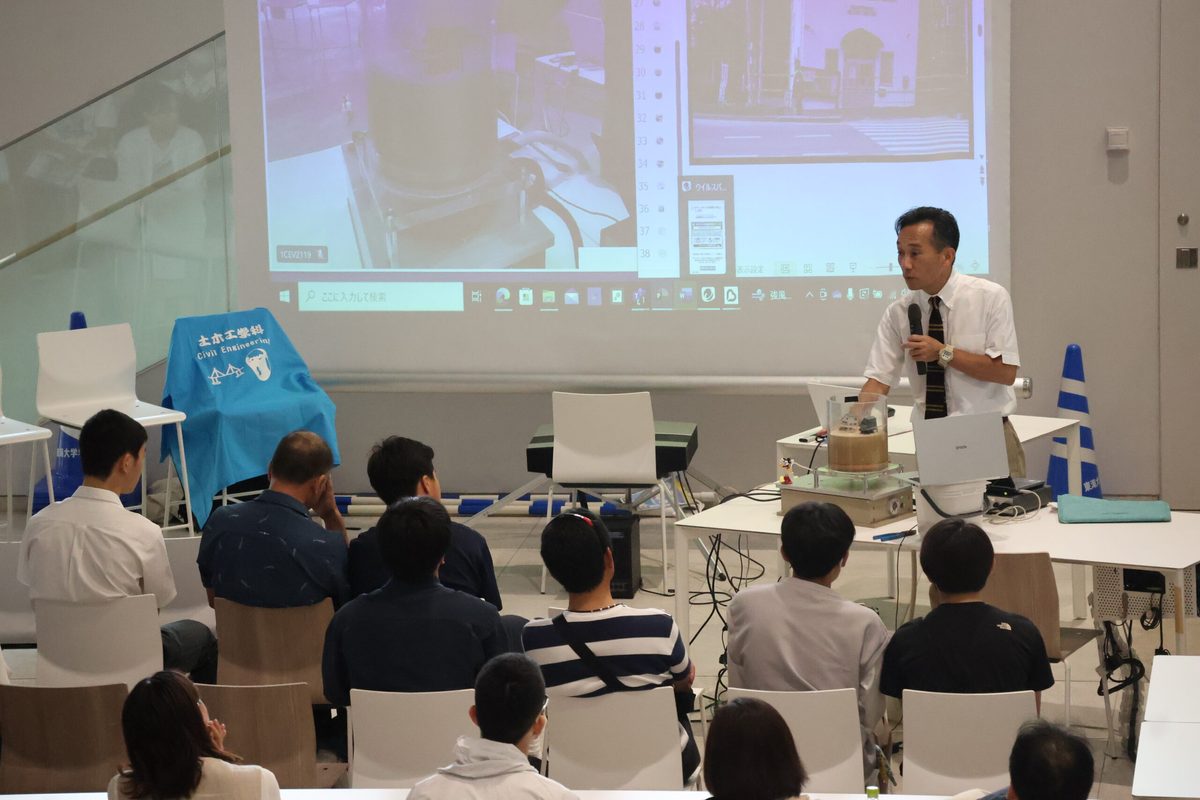 在学生や卒業生によるトークセッションでは、多くの方が耳を傾けておられ、実際の大学生が送っているキャンパスライフの様子や土木工学科の就職状況に興味を持っていただけた様子が伺えました。そのほか、津波実験や液状化実験は、質問が出るほど熱心な参加者もおられるなど、土木フェスタは大盛況のうちに終えました。