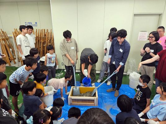 建築都市学部建築学科の学生有志による実験サークル「Matière de Architecture Club (MAC)」が8月1日に、川崎市高津区の高津市民館で開催された「小学生建築講座~コンクリートを体験してみよう~」に協力しました。この催しは、建築材料としてポピュラーな生コンクリートについて学んでもらおうと神奈川県建築士会コトナ建築部会が企画したもので、以前より親交があった縁でMACに協力依頼がありました。学生たちは6月8日に湘南キャンパスで実施したワークショップの経験を生かしてサポートしました。
