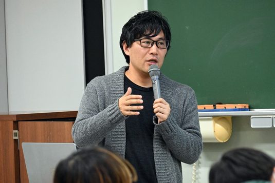 建築都市学部建築学科では11月27日に湘南キャンパスで、建築家・佐瀬和穂氏(大学院工学研究科建築学専攻2007年度修了・佐瀬和穂建築設計事務所)による講演会を開催しました。1年次生の授業「入門ゼミナールB」で実施している卒業生のリレー講座第2回として開いたものです。「ニセカイジュウタク」で「2024年日本建築学会作品選集新人賞」を受賞した佐瀬氏が講師を担当し、自身が手がけた作品への思いなどを語りました。