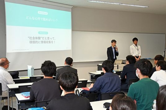 当日は、初めに三神教授があいさつに立ち、「日ごろ学生からインターンシップについて多くの質問を受けるので、企業の担当者の方から直接話を聞ける機会を設けようと企画しました。最近では“就職活動の試験はインターンシップから始まる”と言われています。企業がインターンシップで学生のどこに注目しているのか、どのように臨むべきかを知り、就職活動に生かしてもらいたい」と語りました。続いて、サイエンス・エンジニアリングカレッジのキャリア担当職員がインターンシップ参加時の注意点を解説。総合建設会社やコンサルティング企業など7社の担当者が登壇し、会社概要や手掛けた施工事業の紹介をはじめ、インターンシップの具体的な内容など説明しました。さらに、事前に学生から寄せられた約40種類にも及ぶ質問に回答したほか、参加企業で勤める土木工学科の卒業生が就職活動の経験談を語り、学生たちにアドバイスを送りました。