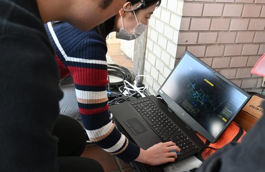 梶田教授の研究室では今回、IoT機器などを扱う商社の岡谷エレクトロニクス株式会社と連携し、レーザー光の反射によって人物や自動車などの距離、形状などを計測する機器「LiDAR(Light Detection And Ranging:ライダー)」を店舗前に設置。高さ約3mの一から直径30m以内の通行量を午前11時から午後4時まで計測し、商店街の利用者の移動状況を調査しました。