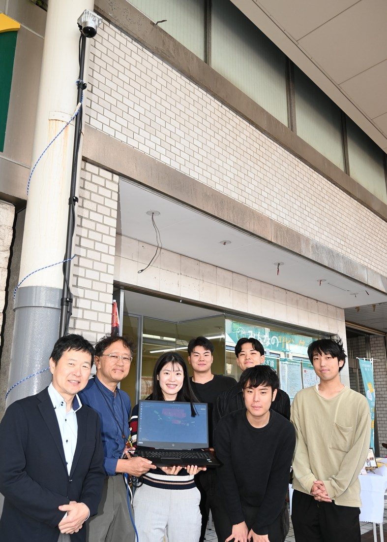 梶田教授の研究室では今回、IoT機器などを扱う商社の岡谷エレクトロニクス株式会社と連携し、レーザー光の反射によって人物や自動車などの距離、形状などを計測する機器「LiDAR(Light Detection And Ranging:ライダー)」を店舗前に設置。高さ約3mの一から直径30m以内の通行量を午前11時から午後4時まで計測し、商店街の利用者の移動状況を調査しました。