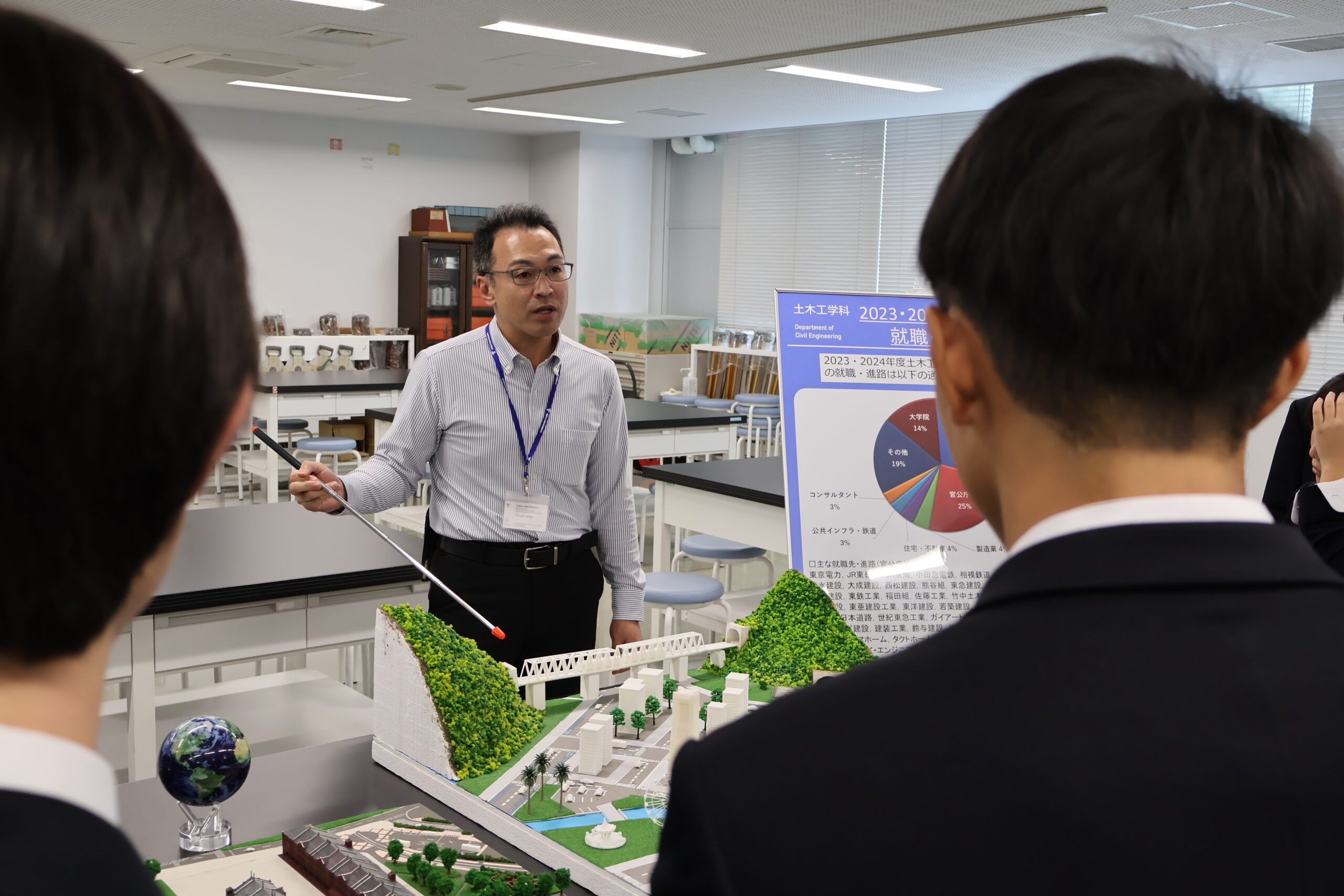 馬場勇介准教授は、「今回の模擬授業を通して、“まちづくり”を担う土木工学の魅力と社会的意義を多角的に知ってもらい、生徒の皆さんにとって将来の進路を考えるうえで大きなヒントになれば嬉しい」とコメントしています。