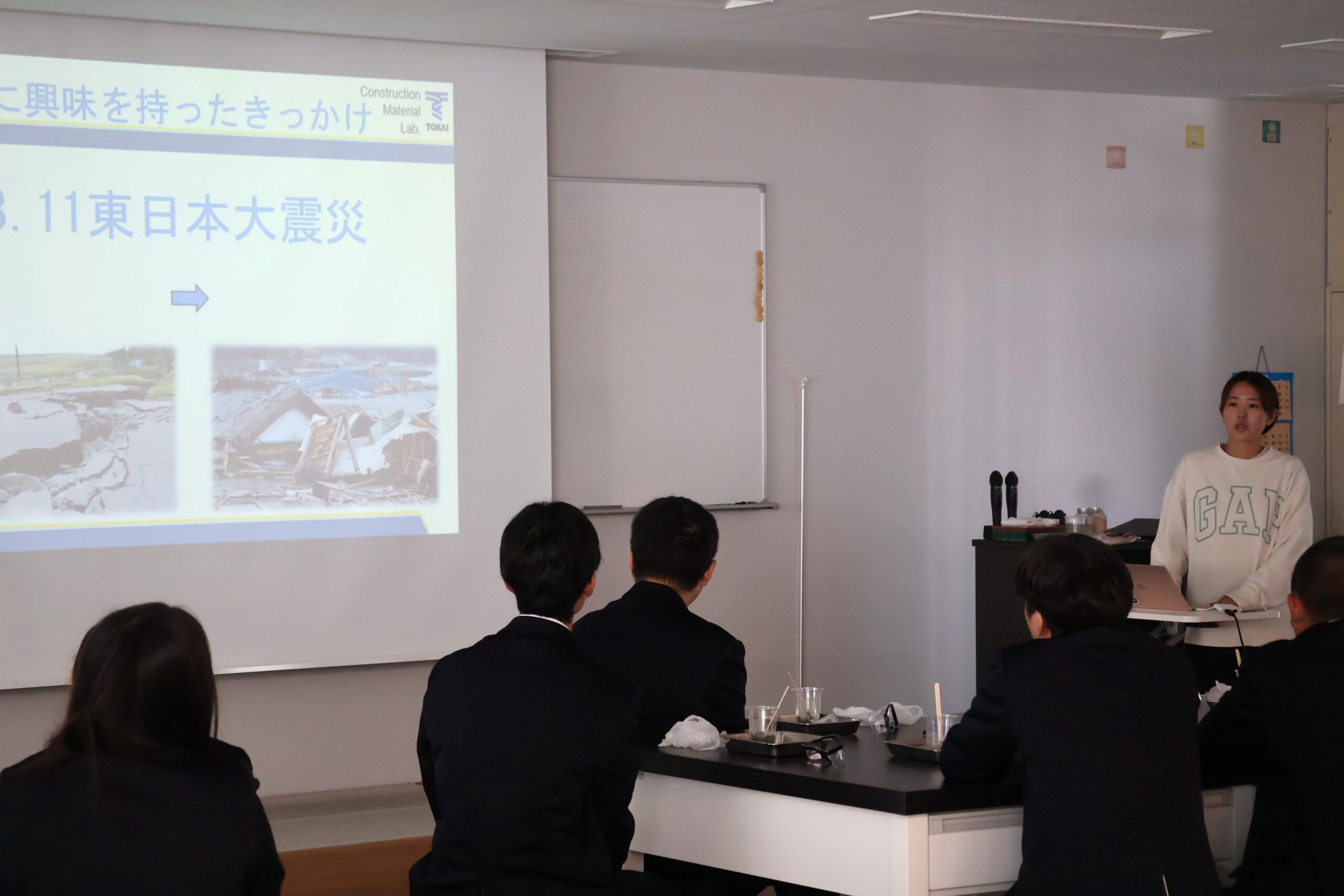 また、同校の卒業生である池野伊吹さん(土木工学科3年)も参加し、後輩の生徒さんにとって身近なロールモデルとして刺激を与えてくれました。授業の最後には、在学生の小野明莉さん(土木工学科4年)によるキャンパスライフの紹介があり、東海大学での学びや部活動、アルバイト、就職活動などについて具体的なエピソードや魅力が語られました。