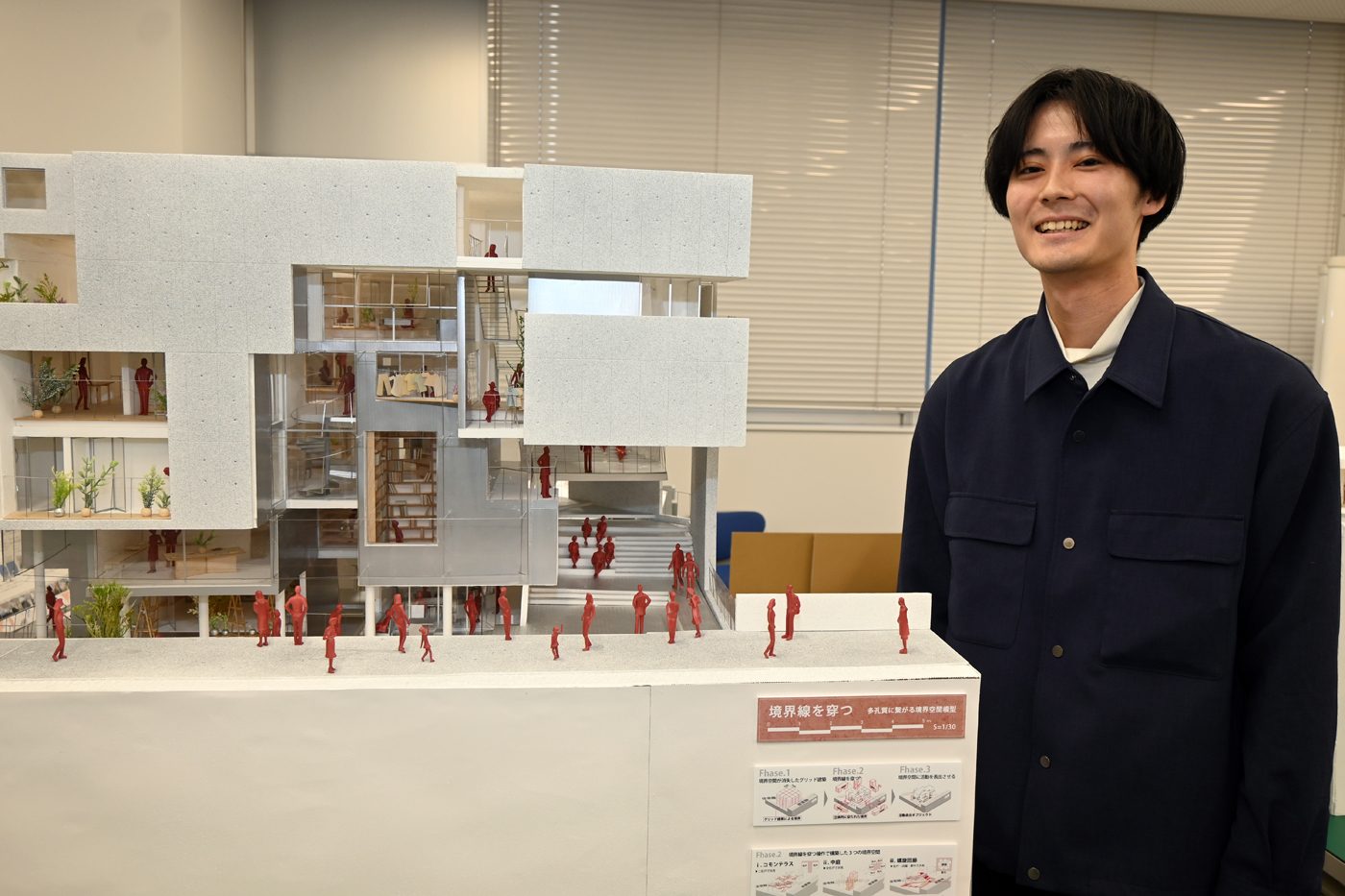 大石さんの作品タイトルは「境界線を穿つ 商住間の段階的活動を促す『境界空間』の構築手法」で、住宅と商業の複合建築を提案しました。従来の箱型建築を定型とする集合住宅に対して、穴を開ける、貫き通すといった「境界線を穿つ」手法によって、国内外の調査を基に仮説・数値化した大小さまざまな境界空間を建物内外に展開しています。境界空間には内部の活動が表出するような仕掛けを施し、「コモンテラス」「中庭」「螺旋回廊」といった公共性の度合いが異なる3つの空間を構築し、個と全体の活動が段階的に波及していく提案となっています。大石さんは、「在学中、槇文彦氏の建築に影響を受けて本研究に取り組みました。特に岩﨑先生の都市デザイン授業で代官山『ヒルサイドテラス』を訪れた際、建物のエッジ(縁)の空間が居心地よく、日本の建築様式である『縁側』を想起しました。その豊かな境界空間に魅力を感じ、学生時代に何度も現地を訪れたことが印象深い思い出です。今後は建築設計者として経験を重ね、時折初心に立ち返り、学生時代の研究を思い起こしながら取り組んでいきたい」と話しています。