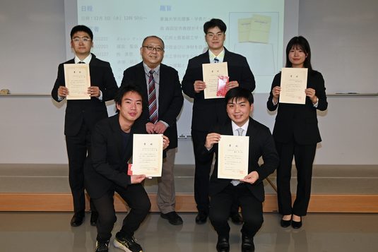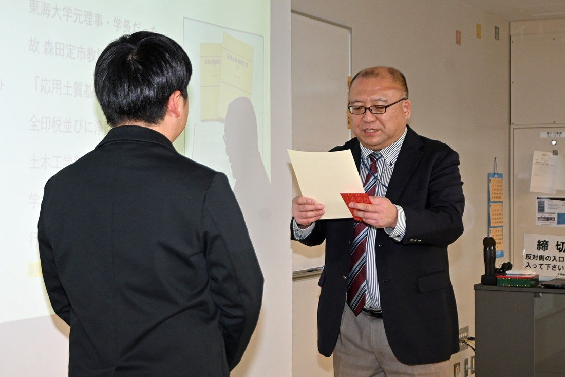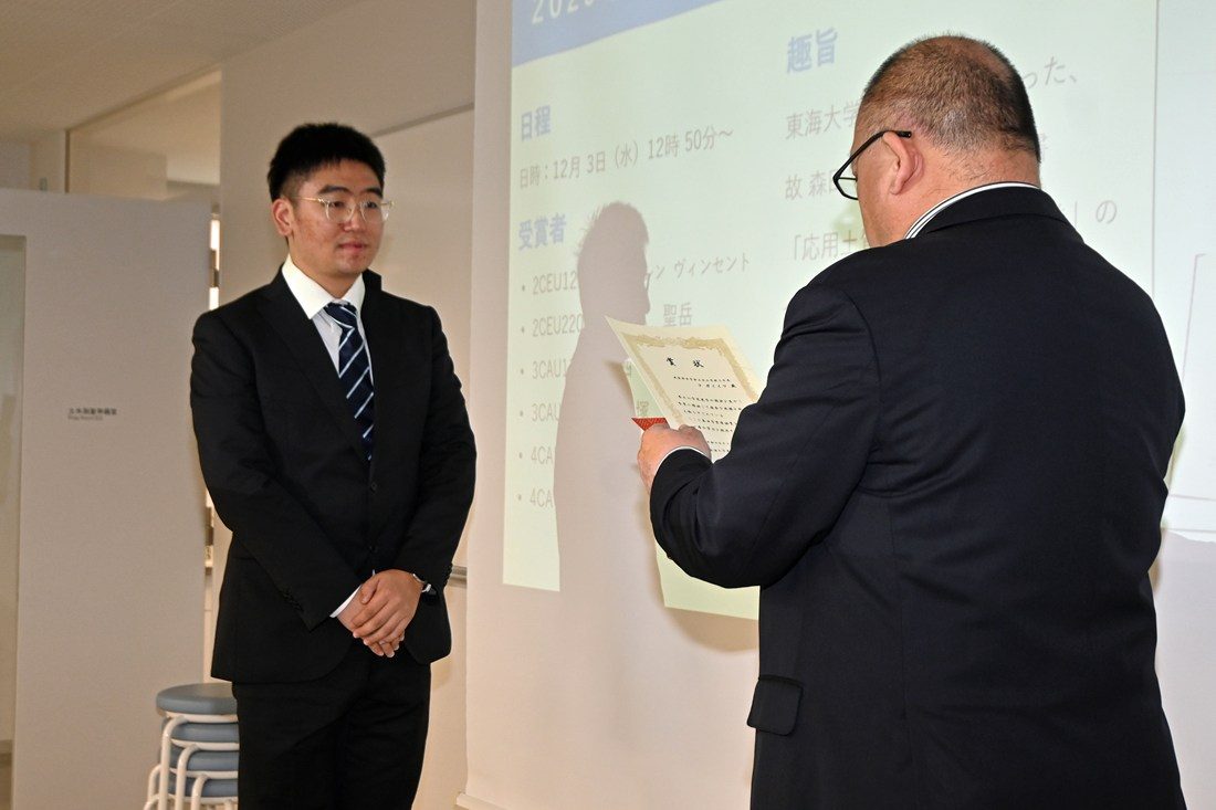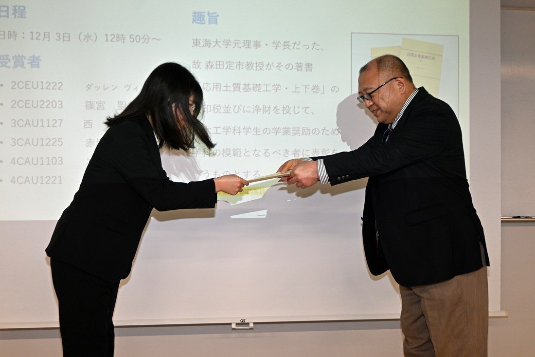 今年度は、4年次生のダッレン ヴィンセントさんと篠宮聖岳さん、3年次生の西美悠さん(都合により授賞式は欠席)と赤塚結凪さん、2年次生のコ ガイイツさんと本橋幸大さんが受賞しました。式では、本学科長の三神厚教授が賞の趣旨を説明し、「皆さんを学科の宝だと考えています。今回の受賞にぜひ誇りを持って模範となる姿を見せ、学内でも卒業後の進路でも大活躍してもらいたい」と期待を語りました。その後、三神教授が一人ひとりに表彰状と図書カードを手渡しました。3年連続で受賞したヴィンセントさんは、「インドネシアから留学したので、大学での貴重な4年間を無駄にしないよう、先生方の応援をいただきながら頑張って勉強してきました。2年次生からの受賞は、日々の授業に対するモチベーションにもつながっています。卒業後は施工関連の企業に就職する予定なので、賞にふさわしい人間、技術者になりたいです」と話していました。