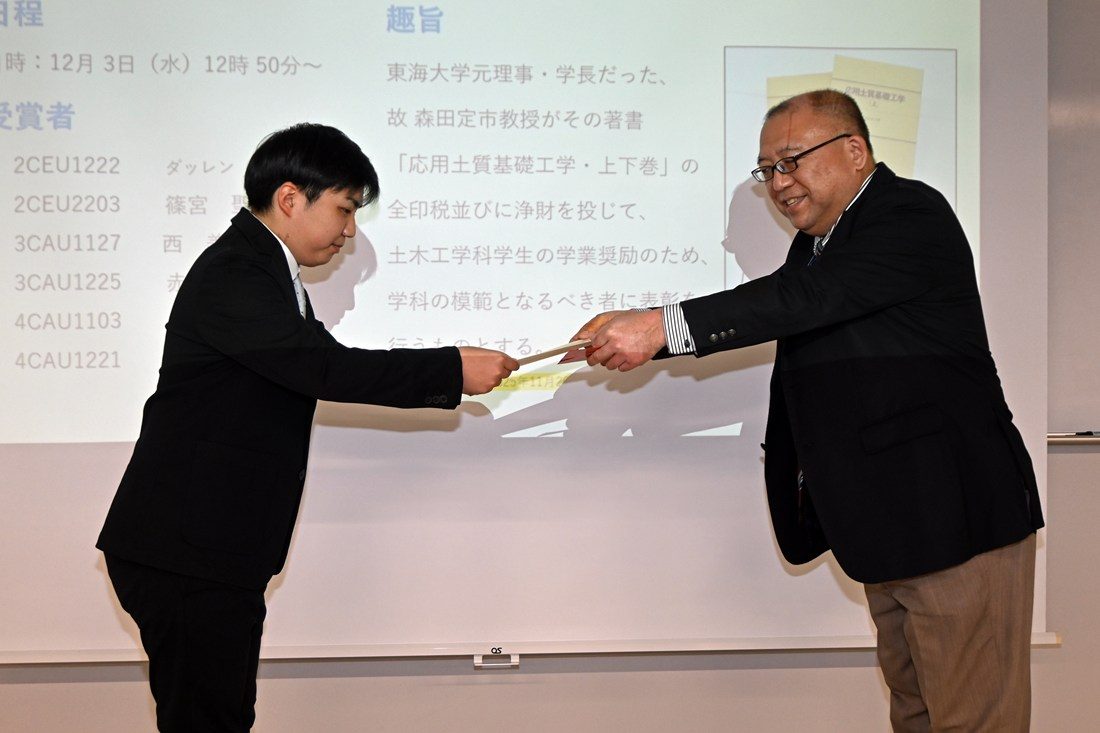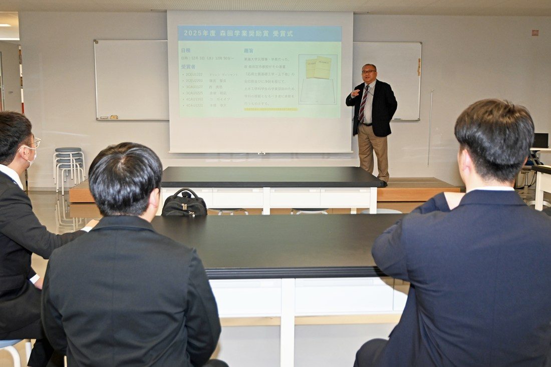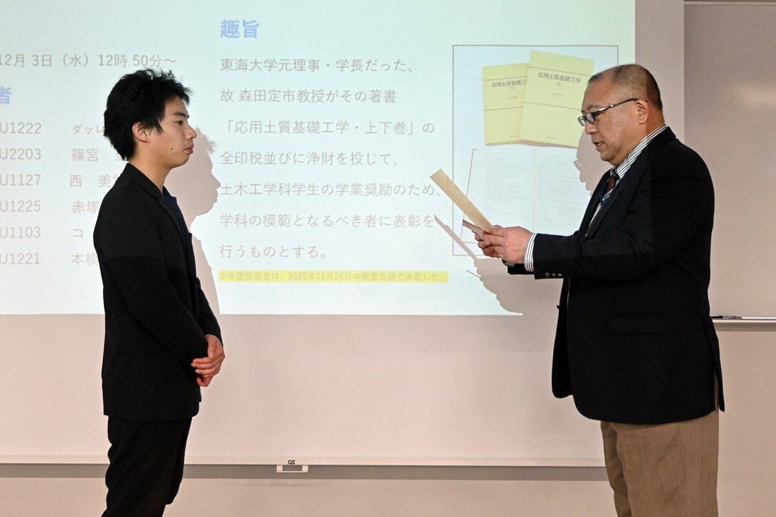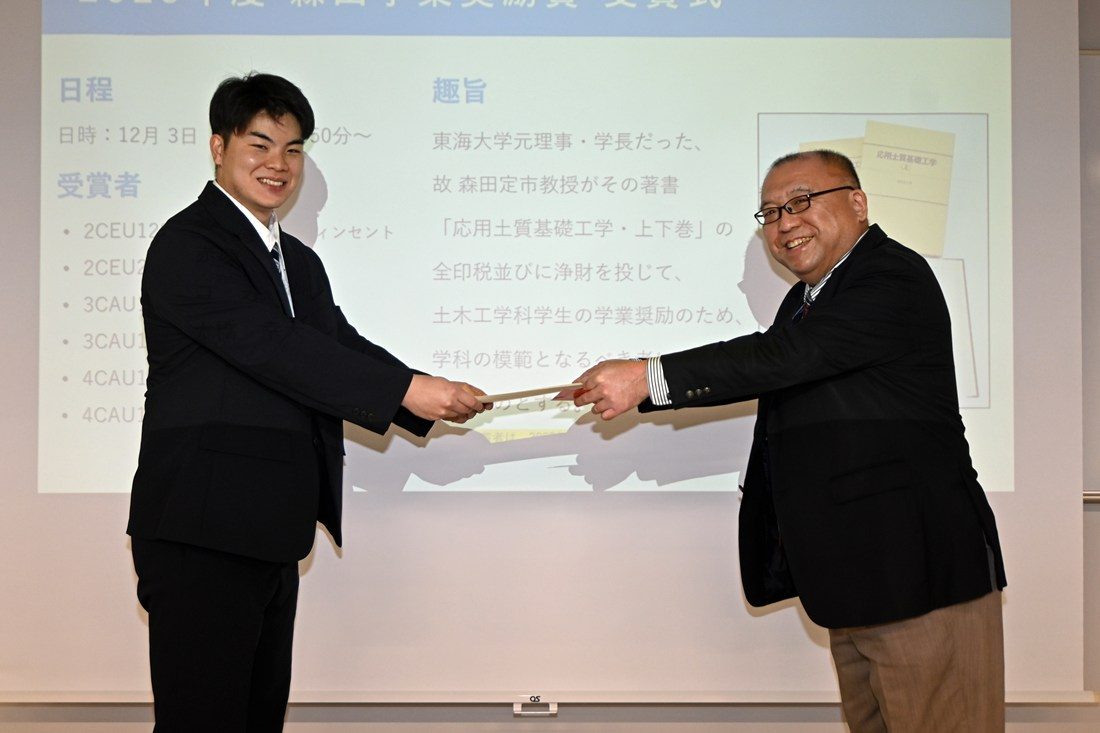 建築都市学部土木工学科では12月3日に、湘南キャンパスで「2025年度 森田学業奨励賞」の授賞式を開催しました。この賞は、東海大学の元理事・学長で本学科の主任教授なども務めた故森田定市教授が、学生の学業奨励のために著書『応用土質基礎工学』上下巻の印税と浄財を投じて制定したものです。毎年1回、成績を考慮して学科の模範となるべき学生を各学年2名ずつ表彰しています。